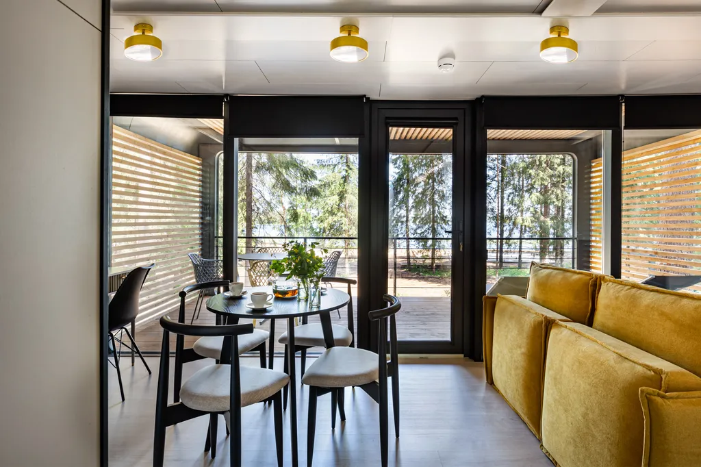 Интерьер в трендовом скандинавском стиле. Мастер-спальная с платяным шкафом и письменным/туалетным столиком, гостиная с экологически чистым биокамином, финская сауна, просторная терраса с видом на Селигер. Двуспальная кровать «Турин» и раскладной диван в гостиной. Регулируемый тёплый пол, кондиционер, холодильник с обновляемым ассортиментом мини-бара, чайник, кофемашина, чайный набор посуды, бокалы для вина, обеденный стол, комод, письменный стол, санузел с душем и сауной, фен. На террасе – обеденный стол, пара шезлонгов со столиком изменяемой высоты. Завтрак включён в стоимость проживания.