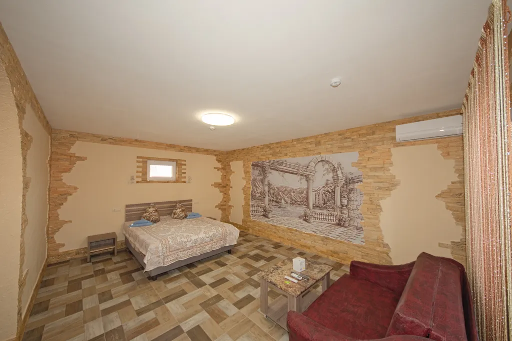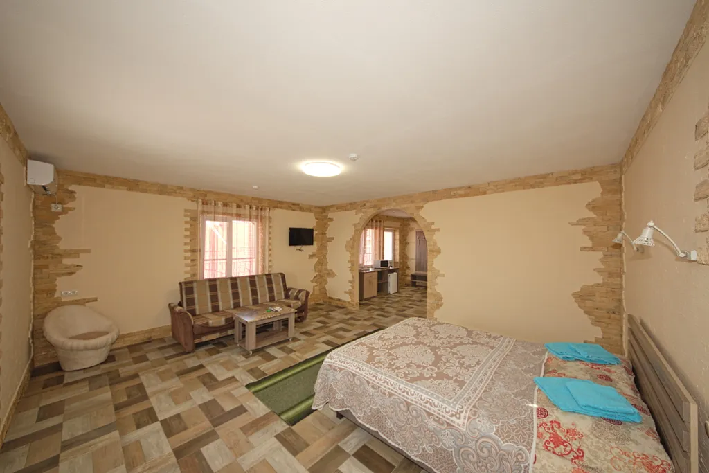 Номера находятся на 3-м этаже. Общая площадь номера 40-45 кв.м. На террасе перед входом в каждый номер, стоит стол и стулья. В номере двухспальная кровать, односпальная кровать, диван, все удобства (душ, умывальник, туалет), горячая и холодная вода, гостиничный фен, комплект посуды, электрочайник, холодильник, микроволновка, телевизор (ЖК), кондиционер. 3-х местное оплаченное размещение - на двухспальной кровати и односпальной кровати. 4-х местное оплаченное размещение - на двухспальной кровати и двухспальном раскладывающемся диване.