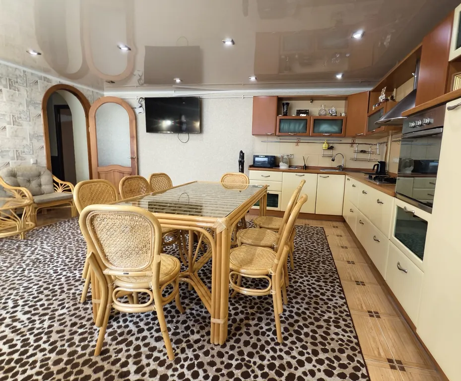 Добро пожаловать в уютный и просторный дом в живописной Ялте! Великолепный дом с собственным бассейном предлагает идеальные условия для комфортного отдыха и незабываемых моментов с семьей и друзьями. Просторные комнаты, современное оснащение и близость к морю делают его идеальным местом для Вашего отпуска. Первый этаж: Кухня-гостиная: Полностью оборудована для Ваших кулинарных шедевров. Здесь Вы найдете телевизор, холодильник, вытяжку, варочную панель, духовку, обеденный стол со стульями, диванчик для отдыха, микроволновку, чайник, а также набор столовых приборов и посуду. Санузел: Удобства включают зеркало, раковину, унитаз и полотенцесушитель. Ванная комната: Оборудована душем и стиральной машиной. Второй этаж: 1 комната: Просторная комната с односпальным диваном, пуфиком, двумя креслами и столиком, телевизором, шкафом для хранения вещей, кондиционером, стенкой, шторами блэк-аут и выходом на балкон. 2 комната: Уютная спальня с двуспальной кроватью, бра, ковровым покрытием, пуфиком,