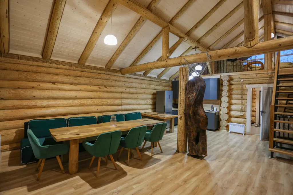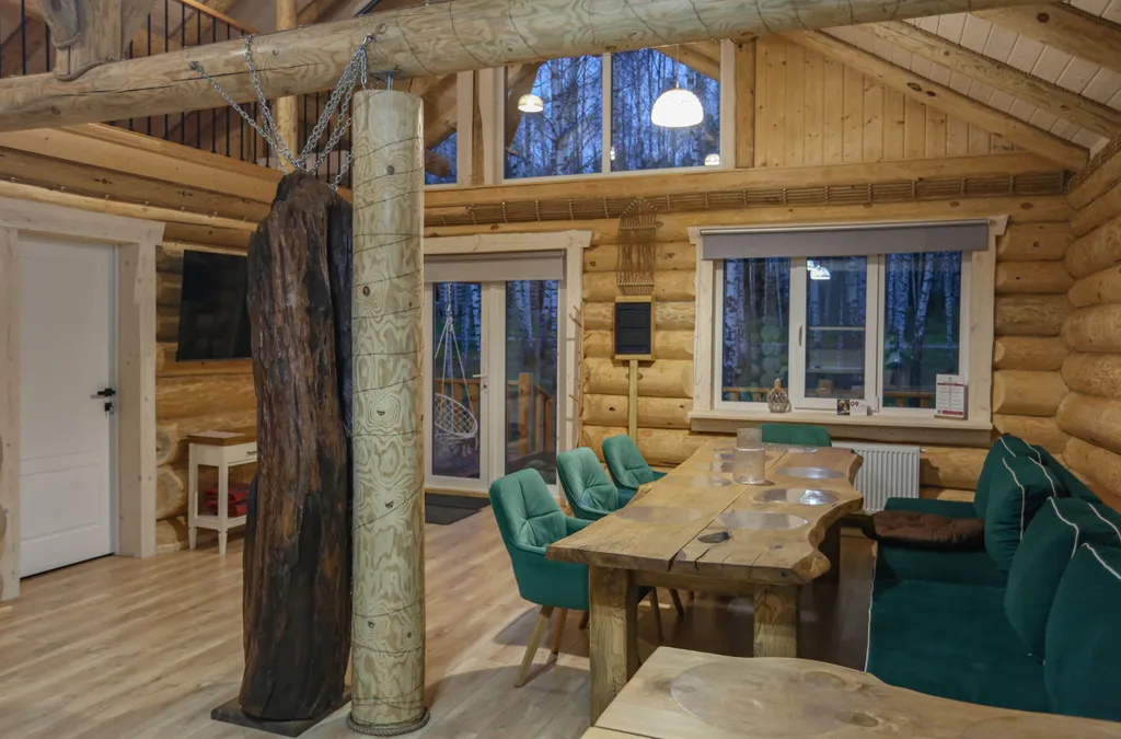 Коттедж «кебрачо» — величественный двухэтажный коттедж с собственной баней-чаном на дровах. Кебрачо является самым вместительным домом в эко-поселке. Главная особенность архитектуры — впечатляющий ствол дерева кебрачо, который служит центральным элементом конструкции и придает дому неповторимый характер. Планировка дома включает: • просторный холл площадью 83 кв. м с массивным столом, рассчитанным на 12 человек — идеальное место для семейных торжеств и дружеских gatherings; • две отдельные спальни, обеспечивающие уединение для всех гостей; • просторную гостиную комнату с выходом на уютную веранду; • открытая ниша с большим угловым диваном, где можно расслабиться в компании друзей. Коттедж выполнен из натуральных материалов с сохранением эко-стиля поселка. Интерьер сочетает в себе современные удобства и природную эстетику, создавая особую атмосферу гармонии с окружающей средой. Территория вокруг дома включает: • просторную беседку для отдыха; • полностью оборудованную мангальну
