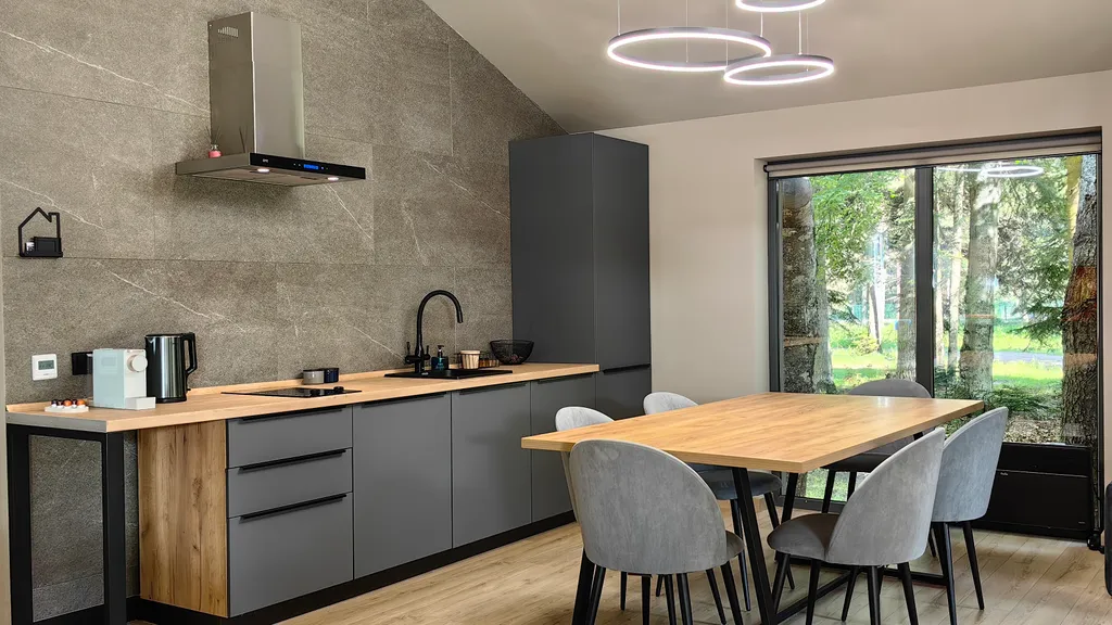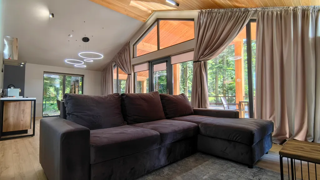Комфортный коттедж вместимостью до 6 человек. В доме 2 спальные комнаты, в хозяйской спальне большая двуспальная кровать, телевизор со Смарт ТВ. Во второй спальне две односпальные кровати, по запросу можно их соединить в одну двуспальную. Также телевизор со Смарт ТВ. Кухня-гостиная оснащена вытяжкой, электрической плитой, микроволновой печью, электрическим чайником, кофемашиной, встроенным фильтром для питьевой воды а также полноразмерным холодильником с морозильной камерой. В гостиной части комнаты имеется большой двухместный диван-кровать и телевизор со Смарт ТВ. Также в коттедже есть сушка для обуви на 5 пар, будь то лыжные ботинки или ваша повседневная обувь. В собственном санузле есть все необходимое (шампунь, гель для душа, мыло, зубные щетки с пастой, фен, полотенцесушитель, также полотенца трех типов (тело, лицо и ноги) тапочки и халаты)