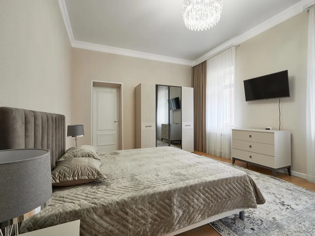 Сдаются посуточно шикарные просторные апартаменты с евроремонтом в самом центре курортной зоны г. Кисловодска. Апартаменты расположены на 2 этаже трёхэтажного особняка. До каскадной лестницы и Ленинского проспекта 2 минуты пешком. До вокзала и Курортного бульвара 5 минут пешком. В квартире имеется всё необходимое для комфортного отдыха: смарт-ТВ, Wi-Fi, два кондиционера, плита, микроволновая печь, чайник, посуда, гладильная доска с утюгом, стиральная машина, сушилка для белья. В двух изолированных спальных комнатах имеются особо широкие кровати. В гостиной имеется огромный диван, который раскладывается с образованием 2-3 спальных мест. В комнатах для комфортного пребывания висят шторы блэк-аут.
