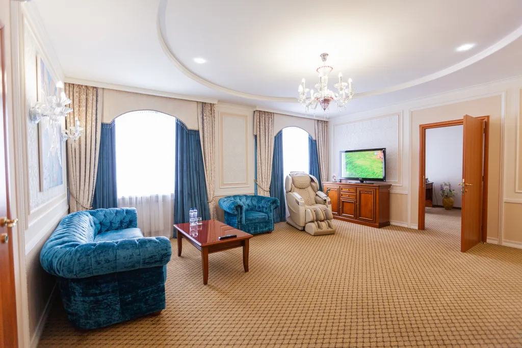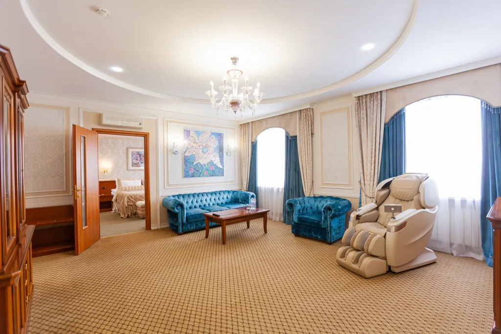 Трёхкомнатный номер на самый взыскательный вкус. В вашем распоряжении спальная, гостиная комнаты и кабинет. В отеле в стоимость проживания включен завтрак. Размещение животных в отеле 3000 рублей за все время проживания. За животное берется возвратный депозит при заезде 5000 рублей. Дети до 4-х лет без предоставления спального места размещение бесплатно. При необходимости размещения детей на доп месте с 4-х лет 4000руб/сут.