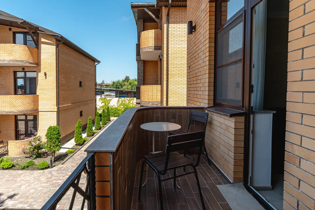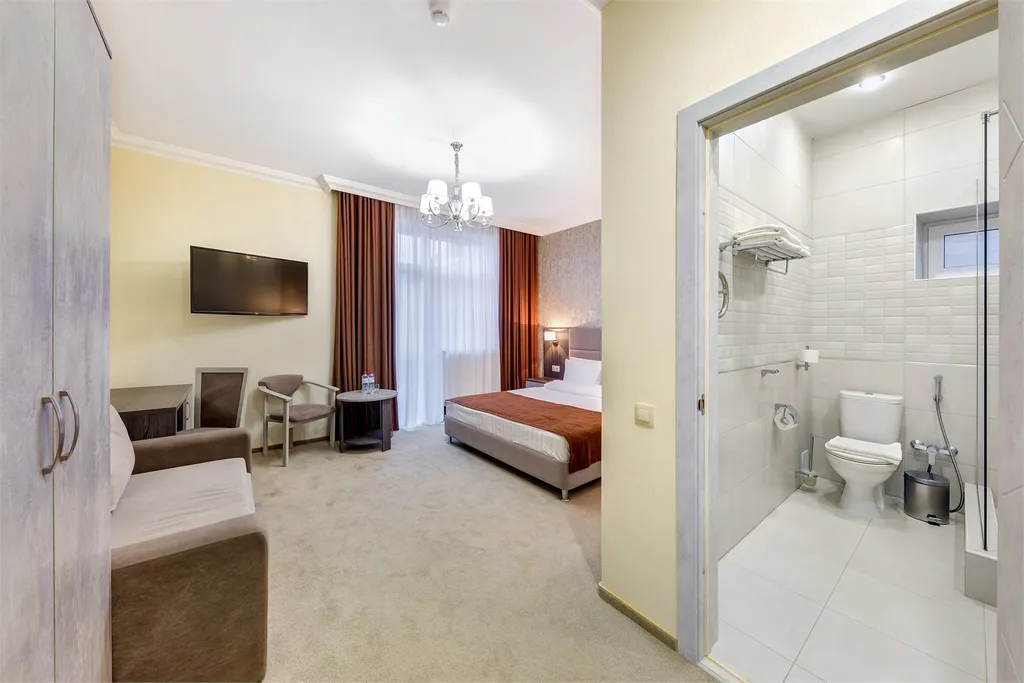 В номере: двуспальная кровать размером king-size, двуспальный диван (130*190см в разложенном виде), прикроватные тумбочки, туалетный столик, зеркало, шкаф, вешалка, сейф, телевизор со Smart TV, кондиционер, мини-холодильник, чайная станция. Ванная комната: душевая кабина, зеркало, зеркало косметическое, фен, комплект полотенец, халаты, тапочки, набор гостиничной косметики. На балконе: стол, два складных стула, сушилка для белья. Один ребенок до 5 лет (включительно) без предоставления спального места проживает бесплатно