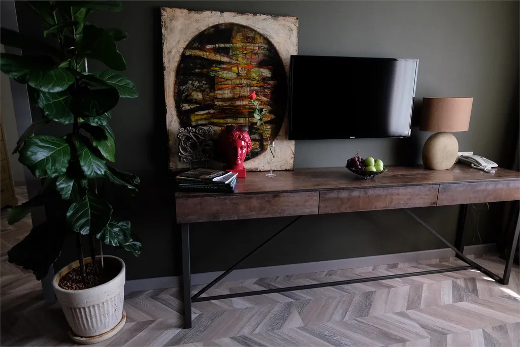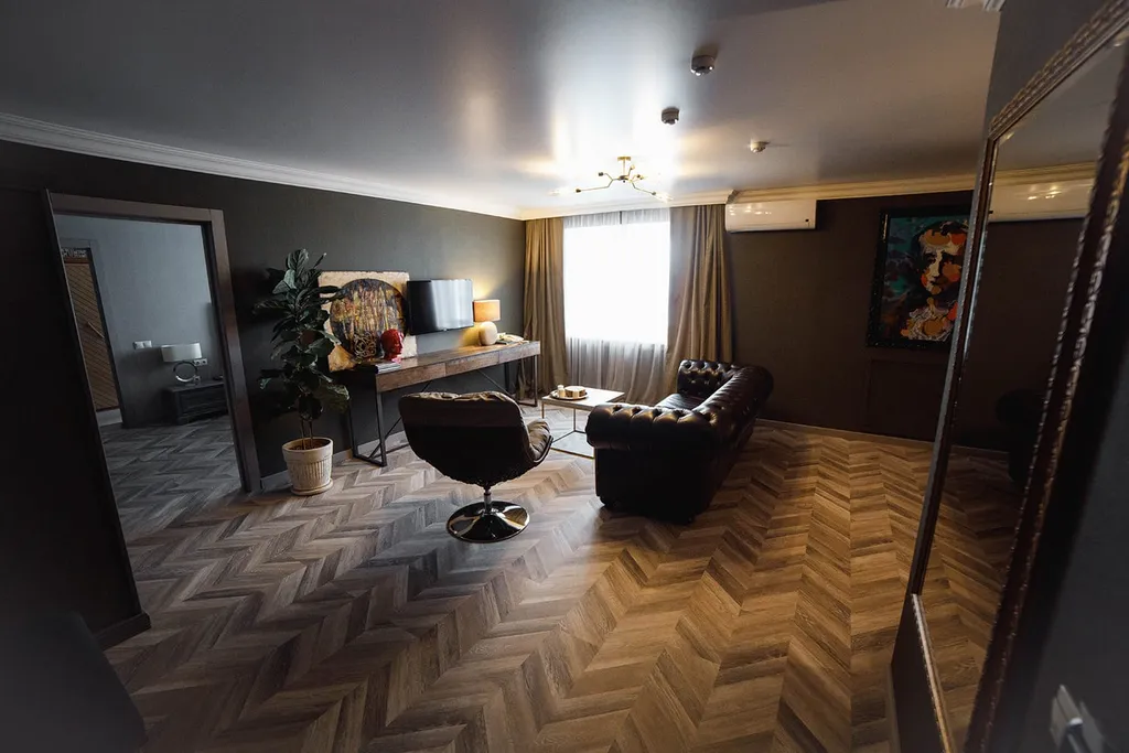Двухкомнатный номер, двуспальная кровать, сауна, джакузи, ТВ, кондиционер, телефон, сейф, мини-бар, душевая кабина, фен, косметические принадлежности, два сан. узла. Вид на Волгу. Завтрак включен в стоимость (шведский стол). Дети до 5-ти лет принимаются бесплатно (за питание доп. плата). Для детей до 3 лет предоставляем (по запросу) детские кроватки. Спа-зона за дополнительную плату.