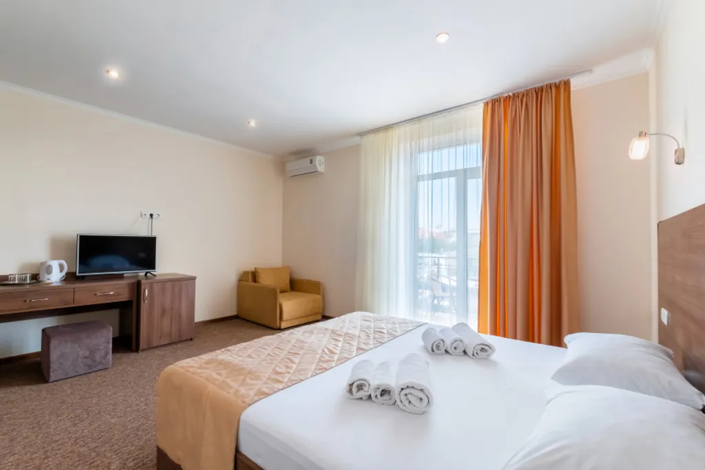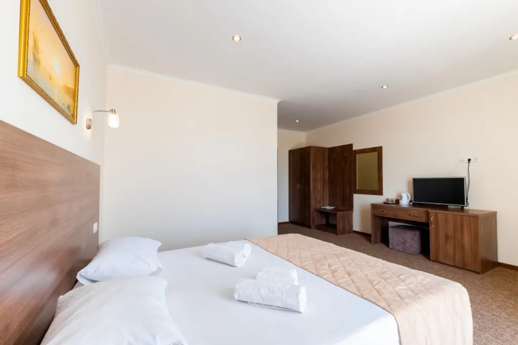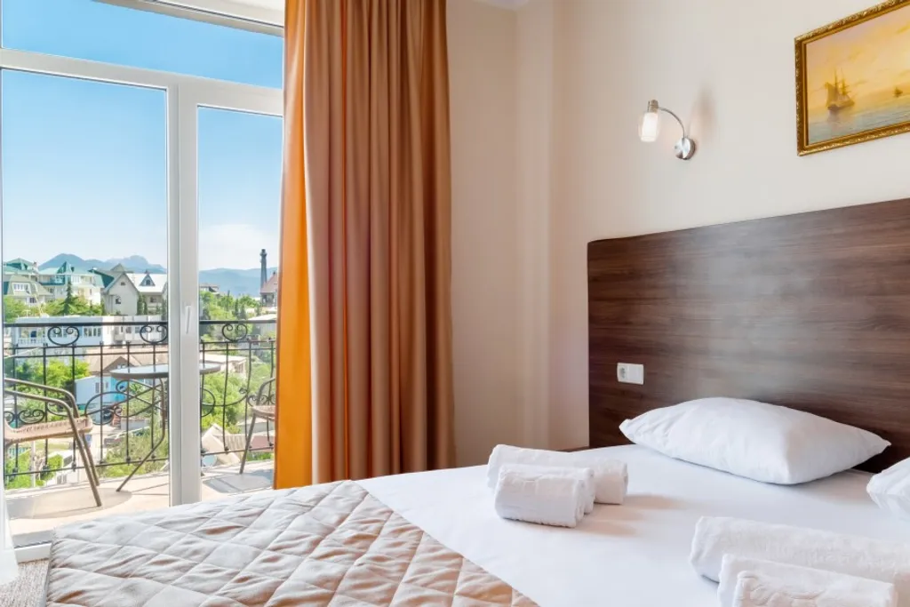 Большой двухместный номер, с прекрасным панорамным видом на крымские горы создаст уют и комфорт для отдыха. Пол: ковровое покрытие. Частота уборки ежедневно. Смена постельного белья 1 раз в 5 дней. Услуги включены в стоимость: -Смена постельного белья -Постельное бельё для всех гостей -Парковка Услуги за дополнительную плату: -Пользование стиральной машиной.