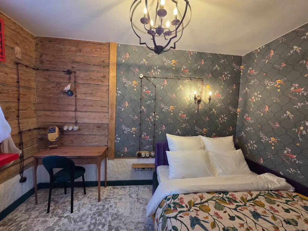 «Зелёная Палата» — это просторный и уютный номер на первом этаже дома XIX века, сохранившего атмосферу традиционного русского сруба. Интерьер сочетает зелёные оттенки, натуральное дерево и элементы народного стиля, создавая спокойное и умиротворяющее пространство. На этаже имеется общая кухня со стиральной машиной. Печь растапливать запрещено.
