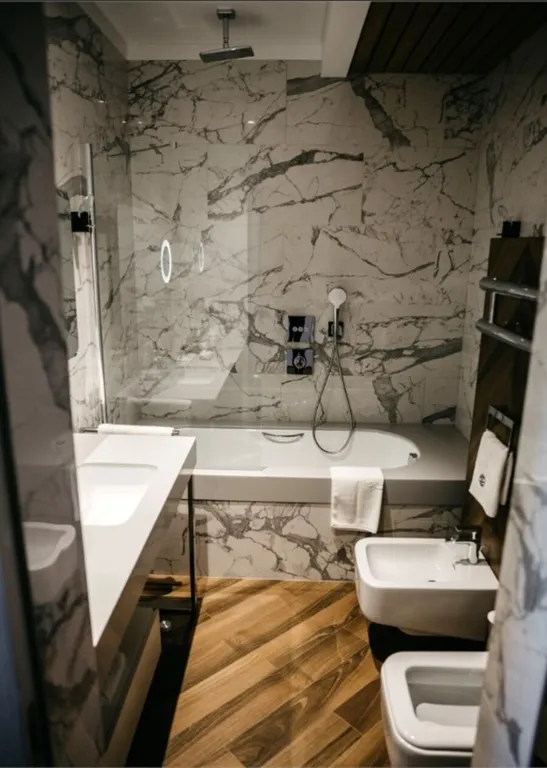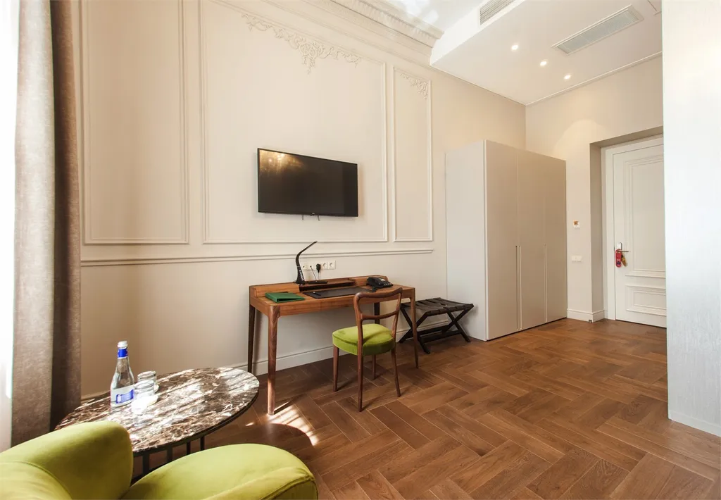 Номер «джуниор» – более просторный. Он дополнен удобным диваном, а в остальном в нем все так же, как и в «стандарте»: есть два кресла, столик, рабочая зона (стол и два стула), 2 односпальные кровати, две прикроватные тумбочки.