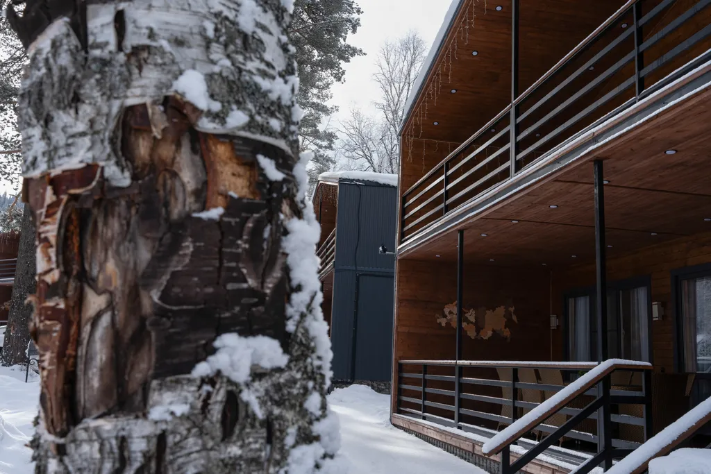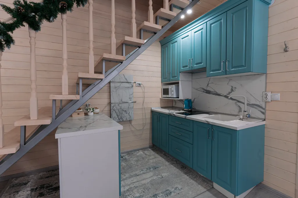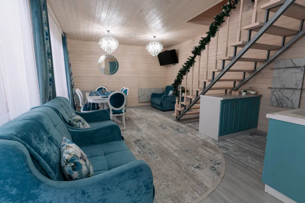Дом выполнен в стиле барокко в бирюзово-белом оттенке. Первый этаж Самая первая комната представляет собой смежную кухню и гостиную. На кухне есть всё самое необходимое: холодильник, чайник, микроволновая печь, электрическая плита, телевизор, столовые принадлежности (тарелки, приборы, бокалы, чашки, костромские сковородки, тазики для маринада, салатницы, терка, доски для готовки), салфетки, тряпки и моющее средство из серии biomio (российская экологическая марка бытовой химии). В гостиной можно увидеть три раскладных кресла, шкаф, в котором можно найти халаты, одноразовые тапочки на каждую персону, постельное бельё и халаты для детишек, дополнительный комплект постельного белья, а также сейф; телевизор, подключенный к интернету, стол со стульями, рассчитанный на 8 персон. В кладовой вы найдете гладильную доску с утюгом, ручной пылесос, сушильную доску. В ванной комнате присутствуют все удобства: зубные наборы, мыло, одноразовые бритвы, шампунь и гель для душа из серии biomio
