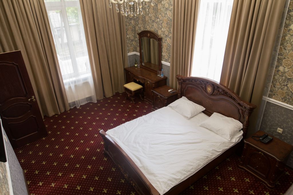 Мини отель на 12 номеров « De Luxe» располагается в Ессентуках в пешей доступности от городского озера. У отеля своя собственная парковка. Проехав 10 минут на маршрутном такси,( остановка в 100 метрах от отеля) гость может прогуляться по Центральному лечебному парку г Ессентуки ,где может попить минеральной воды Источников № 4,17 и Новой. В отеле 3 категории номеров: стандарт,полулюкс и люкс.В номерах комфортно размещаются как 2 так и один человек .В номере « Люкс двухкомнатный» имеется возможность размещения до 4 х человек. Все номера оснащены кондиционерами,чайниками,телевизорами и собственной ванной комнатой со всеми принадлежностями.В отеле есть возможность заказать еду у наших партнеров прямо в номер: это столовые,кафе,рестораны( доставка от 30 минут) Стойка регистрации работает 24/7, как и WI-Fi на всей территории отеля.