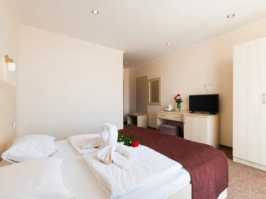 Элегантный номер класс "Полулюкс", общей площадью 24 кв. м., выполненный в теплых бежевых тонах. Панорамный вид с номера на Черное море и величественную Генуэзскую крепость будут восхищать своей красотой. Для вашего удобства в номере есть все необходимое. Пол: ковровое покрытие. Частота уборки (ежедневно). Смена постельного белья (раз в пять дней). Услуги включены в стоимость: -Смена постельного белья -Постельное белье для всех гостей -Парковка Услуги за дополнительную плату: -Пользование стиральной машиной.