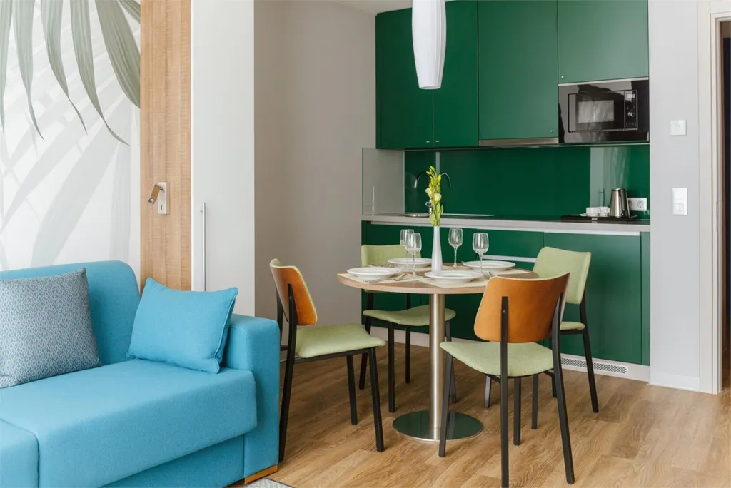 Улучшенный апартамент с одной спальней, оборудованный комплектом кухонной мебели и обеденной зоной с огромной террасой не оставит равнодушным никого. Великолепный вид на парковую зону отеля позволит отдохнуть и расслабится, лежа на шезлонге и слушая пение птиц. Допускается размещение с животным, кошка или собака до 45см в холке. Кроме бойцовских пород. Стоимость размещения животного с мая по сентябрь включительно-2000 руб/сутки, с октября по апрель - 1000 руб/сутки.При заселении для животного предоставляется миска и лежанка, а так же одноразовый набор для уборки. Дети до 6 лет, размещаются бесплатно на основном месте.