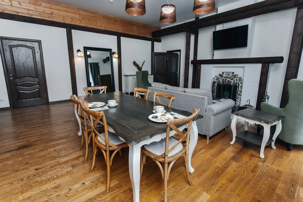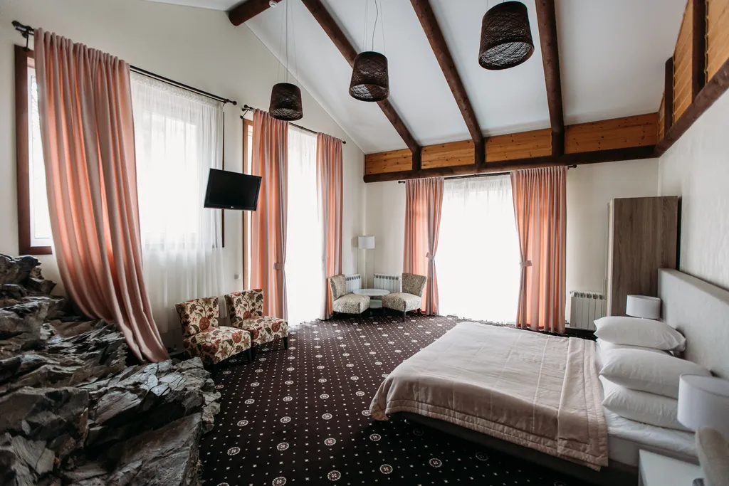 Дети до 6 лет — можно без отдельного спального места. Панорамные окна с видом на реку и гору, балкон и терраса с лежаками.