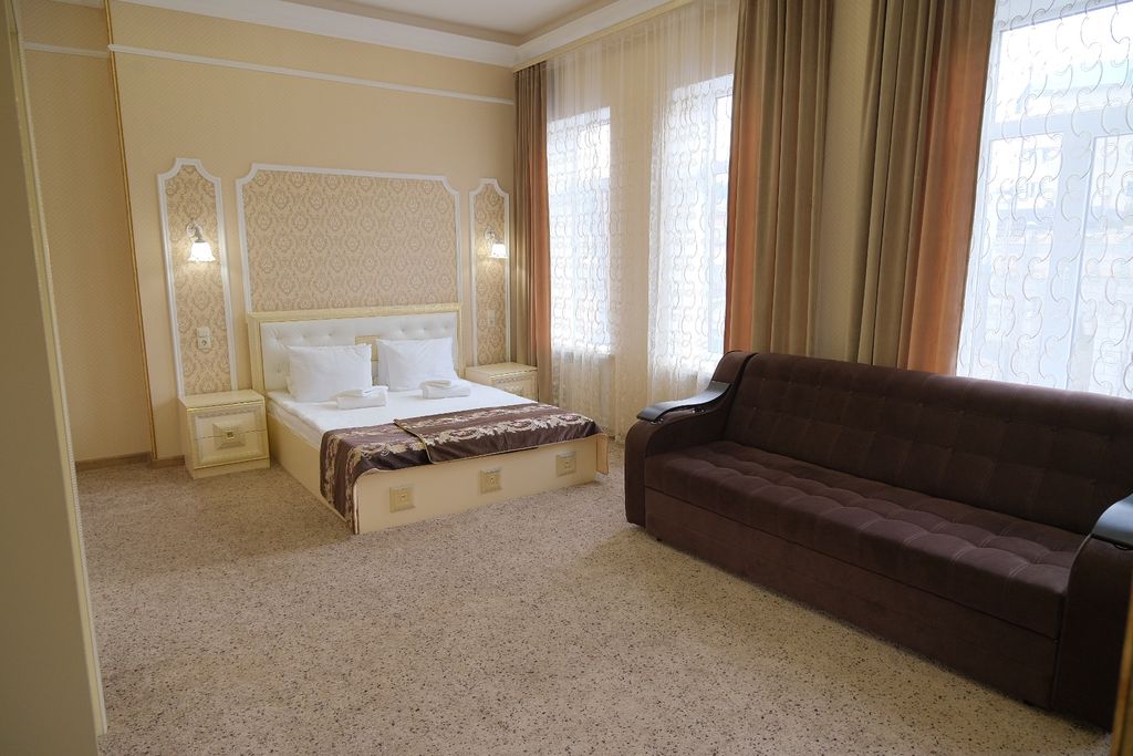 Гостиница в историческом особняке, отреставрированное здание начала прошлого века. Номера «комфорт», «делюкс» и «семейный полулюкс». В номерах красивая светлая мебель, холодильник, широкая кровать. Чайник и микроволновка. Посуда. Санузел. Халаты и тапочки.