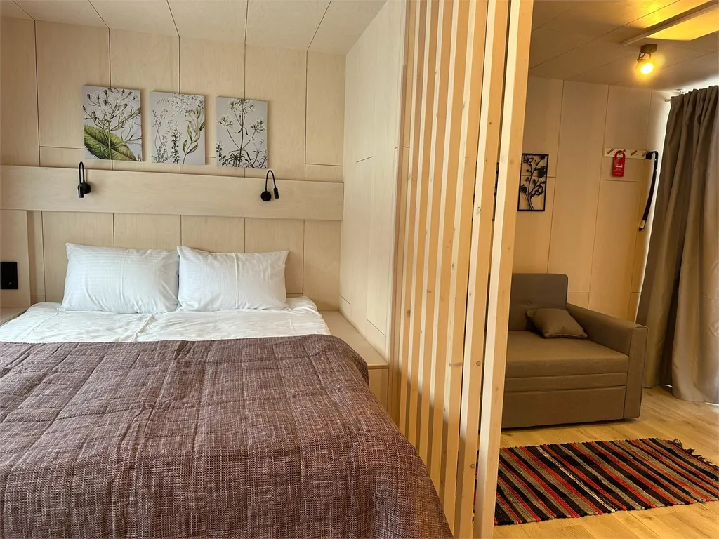 Домик на троих, двуспальная кровать + кресло-кровать (90*200). Теплый уютный и комфортный домик. В домике - душ, туалет, комод для хранения вещей, TV, мини-кухня со всем необходимым. Постельное белье, полотенца, фен, одноразовые гигиенические принадлежности, тапочки и шапочка для душа входит в стоимость. Завтрак включен в стоимость.