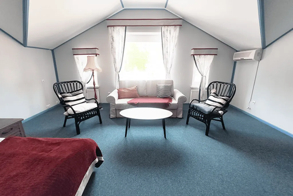 Дети до 3-х лет можно бесплатно без предоставления дополнительного места. Просторный и изящный люкс рассчитан на проживание четырёх человек. В номере есть стильная ванна с банными халатами для гостей. Люкс выполнен в современном стиле: здесь больше мебели, чем в номерах категорий полулюкс и стандарт. Номер продуман до мелочей и понравится даже самым взыскательным гостям. Элементы декора в русском стиле и мелочи вроде розеток рядом с кроватью сделают ваше пребывание в отеле особенно приятным и создадут ощущение домашнего уюта.