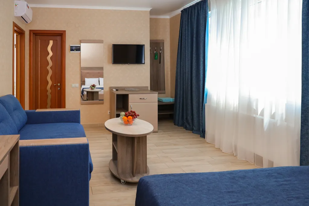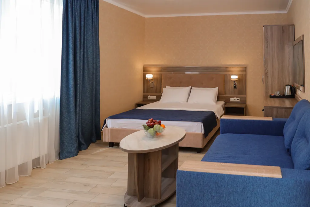 Размещение детей : До 3 лет бесплатно с 4-6 лет включительно 1000 руб. на доп месте с 7-12 лет включительно 1500 на доп месте. Номер категории "Стандарт Комфорт" однокомнатный номер без балкона с живописным видом на гору Кастель.