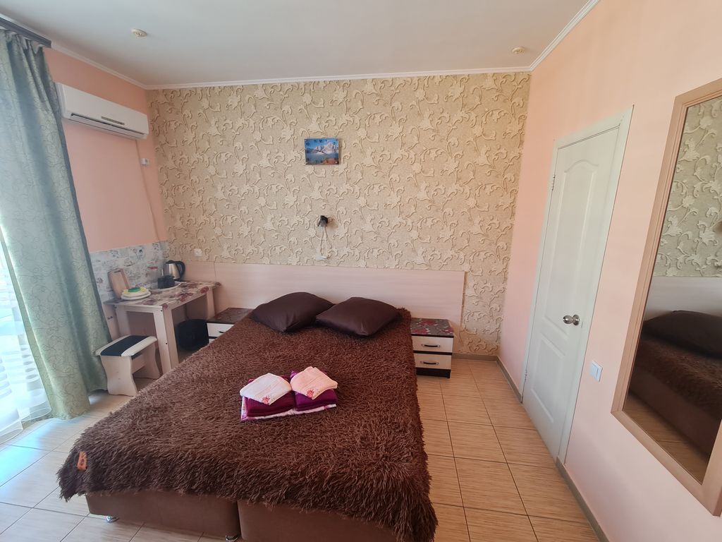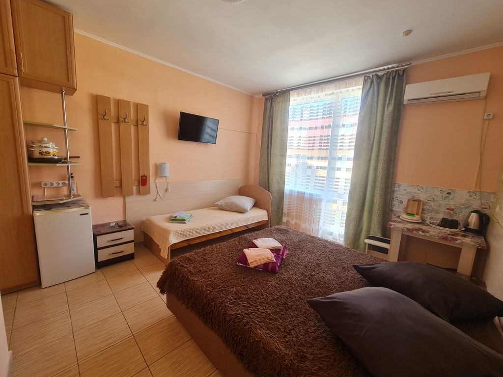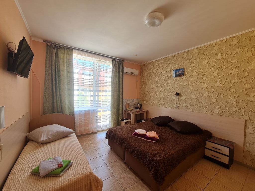 Приглашаем Вас провести ваш отдых в Крыму. Наш отель находится в центральной части базы отдыха Скиф, которая расположена на западной части Черного моря, в курортном поселке Николаевка, это 36 км. от Симферополя. До берега моря от отеля 200 метров. Во дворе отеля очень уютная беседка, детская площадка, мангальная зона. Полностью оборудованная общая кухня, в которой есть вся необходимая посуда для приготовления пищи. В каждом номере свой отдельный душ, туалет, холодильник, телевизор, кондиционер, чайник, бесплатный wi-fi. Открытый бассейн гармонично вписывается в атмосферу отдыха, позволяя наслаждаться свежим воздухом, солнечными лучами и атмосферой курортного комфорта прямо на территории отеля. Особое внимание мы уделили удобству гостей всех возрастов. Бассейн разделён на взрослую и детскую зоны, что делает отдых безопасным и комфортным для семей с детьми. Пока взрослые могут спокойно плавать и отдыхать, маленькие гости смогут весело проводить время в специально оборудованной безопасно
