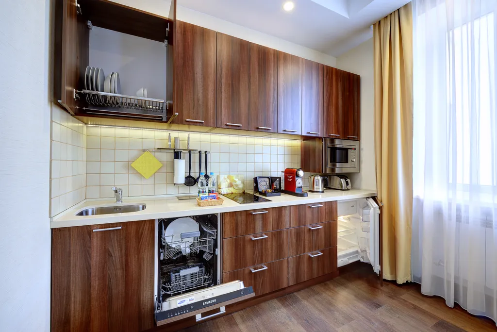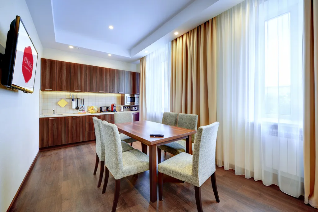 Достоинство апартаментов «Бизнес» в корпусе II — это дополнительное пространство гостиной комнаты с кухней-столовой, диван-кровать, ванная и отдельная спальная комната с поворотным телевизором. Оснащение кухни: плита и вытяжка, холодильник с морозильной камерой, посудомоечная машина, микроволновая печь, тостер, кастрюли, сковороды, столовые приборы.