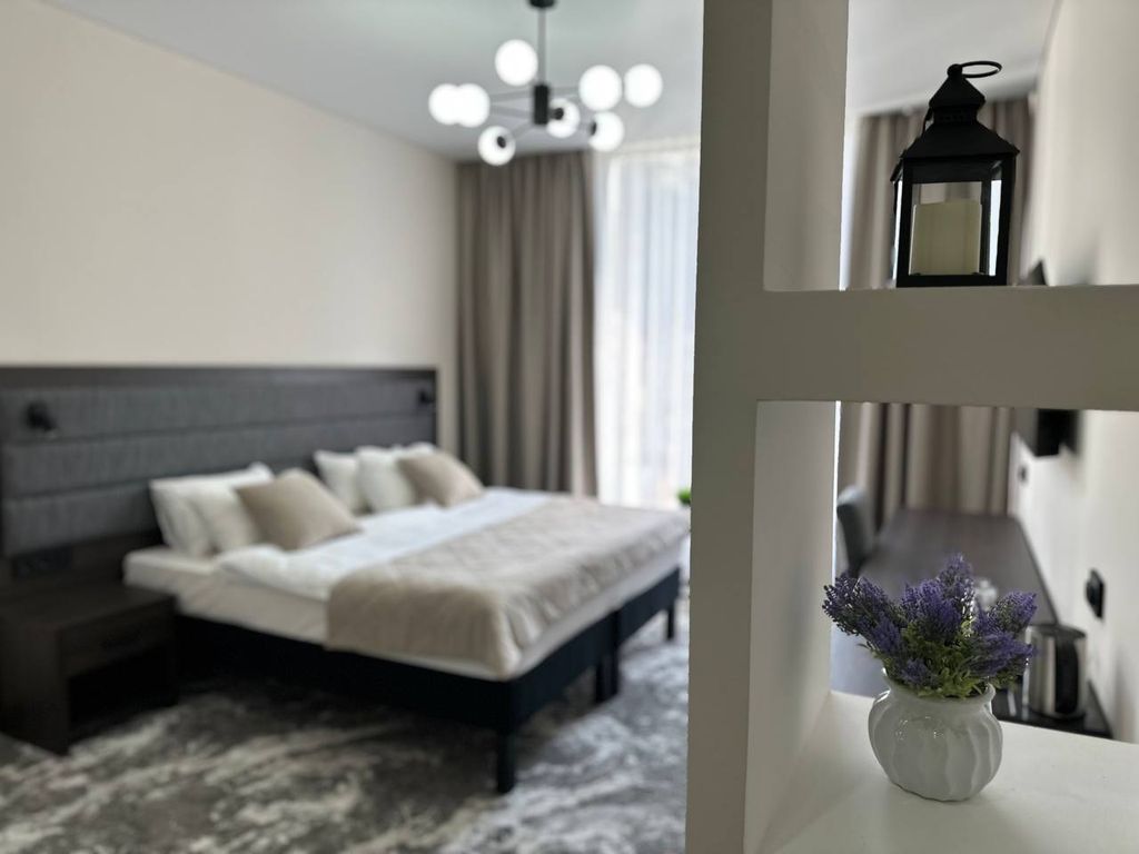 Номера категории Стандартный, Стандартный плюс, Полулюкс и Двухкомнатный Люкс с балконом. В номерах большая двуспальная кровать, рабочая зона, прикроватные тумбы и дополнительное освещение, душевая, постельное белье, полотенца и фен. Зимой включается подогрев полов в душевой. Во всех номерах бесплатный WiFi. На территории отеля имеется Мангальная зона и Русская баня. На первом этаже функционирует кафетерий (питание оплачивается отдельно).