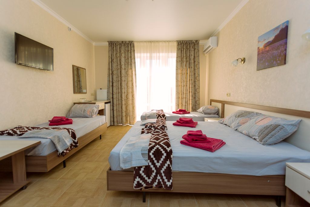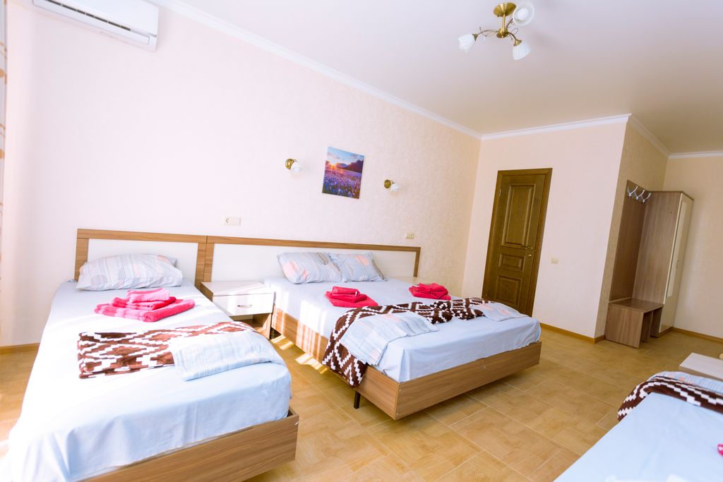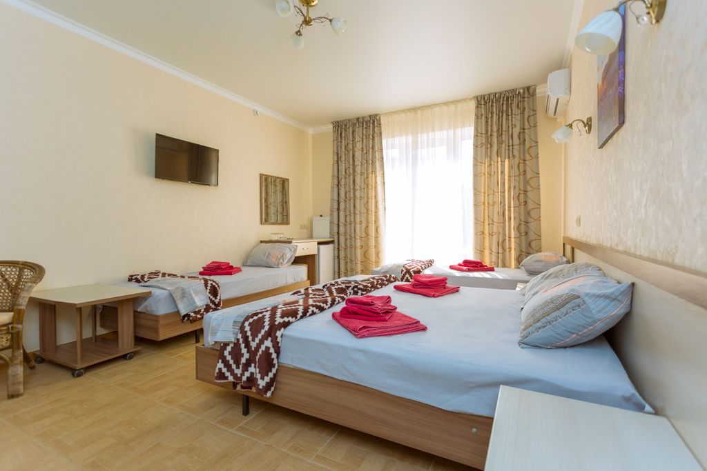 Новый отель «Трио» ждёт вас в тихом районе Анапы на тенистой улице. До галечного пляжа около 10 минут ходьбы, через зелёный парк «Ореховая роща». Где Вы насладитесь запахом цветущих роз и свежестью воздуха от капель воды поющего фонтана, позанимаетесь на тренажёрах, а ваши дети порезвятся на оборудованной детской площадке. Ещё несколько минут ходьбы и перед вами откроется море, и будете вы им любоваться до заката солнца, в лучах которого не редко здесь плавают дельфины. До песчаного пляжа можно добраться на общественном транспорте, остановка находится неподалёку. Рядом расположены: банкомат «Сбербанка», аптека, магазины, почтовое отделение, супермаркет «Магнит», «Агрокомплекс натуральной кубанской продукции», два раза в неделю сельская ярмарка привоз, кондитерская пекарня, салон красоты. Рядом с нами: Недалеко от гостевого дома расположены магазины, кафе, рынок, остановка общественного транспорта.