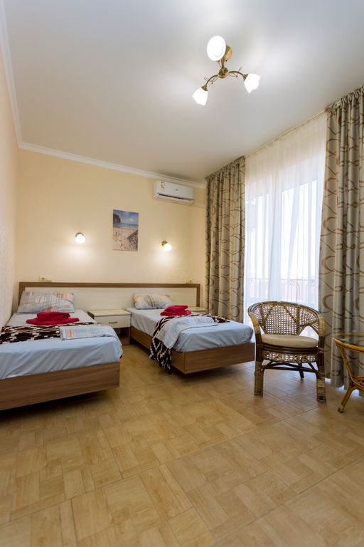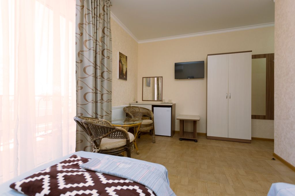 Новый отель «Трио» ждёт вас в тихом районе Анапы на тенистой улице. До галечного пляжа около 10 минут ходьбы, через зелёный парк «Ореховая роща». Где Вы насладитесь запахом цветущих роз и свежестью воздуха от капель воды поющего фонтана, позанимаетесь на тренажёрах, а ваши дети порезвятся на оборудованной детской площадке. Ещё несколько минут ходьбы и перед вами откроется море, и будете вы им любоваться до заката солнца, в лучах которого не редко здесь плавают дельфины. До песчаного пляжа можно добраться на общественном транспорте, остановка находится неподалёку. Рядом расположены: банкомат «Сбербанка», аптека, магазины, почтовое отделение, супермаркет «Магнит», «Агрокомплекс натуральной кубанской продукции», два раза в неделю сельская ярмарка привоз, кондитерская пекарня, салон красоты. Рядом с нами: Недалеко от гостевого дома расположены магазины, кафе, рынок, остановка общественного транспорта.