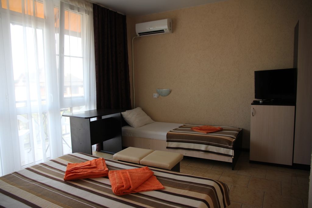 Новый гостевой дом в Джемете. Уютные номера, благоустроенная территория. Всё, что нужно для идеального отдыха! До моря 15 минут пешком. Установлен резервный генератор на случай отключения электроэнергии, который позволяет полностью компенсировать отсутствие электричества у гарантирующего поставщика. Весь комплекс оборудован пожарной сигнализацией. Большой и всегда чистый бассейн с подогревом площадь 100 кв.м.Подогрев осуществляется до температуры 27-30. Собственная пивоварня с рестораном в третьем корпусе. Кухня для самостоятельного приготовления. Мангал и шесть беседок Детская игровая площадка Парковка под видеонаблюдением. WiFi Отдыхающим предлагается размещение в просторных номерах с различной вместимостью, но одинаково комфортных. На трех этажах для Вас однокомнатные 2-3-х местные и двухкомнатные 4-х местные номера. В каждом номере: санузел (душ, туалет), сплит-система, холодильник (с морозильной камерой), телевизор, комплект полотенец, набор посуды. Мебель: односпальные или двус