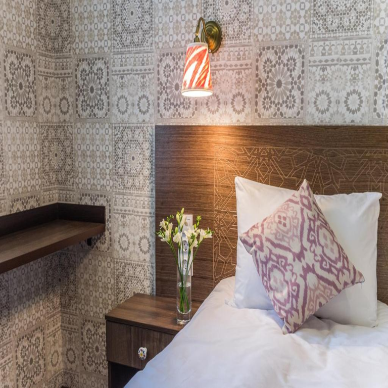 Мы постарались создать отель, который будет не только принимать гостей и создавать им уют, но и сможет хотя бы немного дать им почувствовать особую ауру востока, а особенно чарующей и загадочной средней азии, через большую часть которой пролегал великий шелковый путь. Все номера нашего отеля оформлены в восточном стиле с элементами и арабского, и персидского, и среднеазиатского искусства. В дальнейшем каждому номеру будет присвоено имя одного из городов шелкового пути по порядку их прохождения, и в зависимости от названия, в номере будут присутствовать особые декоративные элементы или картины. Картины с изображением пейзажей и достопримечательностей стран, территории которых входили в великий шелковый путь, мы планируем также повесить в холле отеля. Интерьер отеля мы старались сделать более уютным, в отличие от ресторана «навруз», где он более музейный, поэтому технику ганча и росписи почти не использовали, кроме элементов стен в некоторых номерах и потолка в холле отеля, который расп