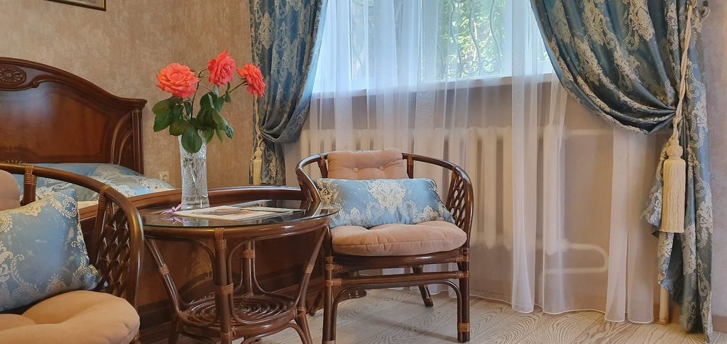 Гостиничный комплекс расположен на холме. С летней террасы открывается восхитительный вид на Воронежское водохранилище. Прилегающие улицы утопают в зелени. А на территории собственного парка свой уютный уголок для отдыха у водопада. Комплекс расположен в самом сердце Воронежа и практически все самые интересные достопримечательности находятся в пешей доступности. Обилие зелени и необычная архитектура города никого не оставит равнодушным. Для размещения предлагаются номера разной ценовой категории и уровня комфортности. В интерьере преобладает классический дизайн со спокойной цветовой гаммой. Основные спальные места представлены двуспальными кроватями. Некоторые номера оснащены ванной-джакузи или душевой кабиной с эффектом «тропический душ». В кафе, которое работает до позднего вечера и без выходных подают блюда европейской кухни.
