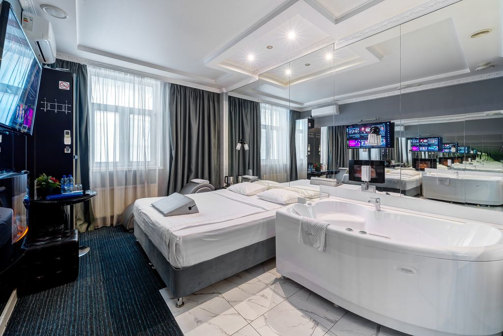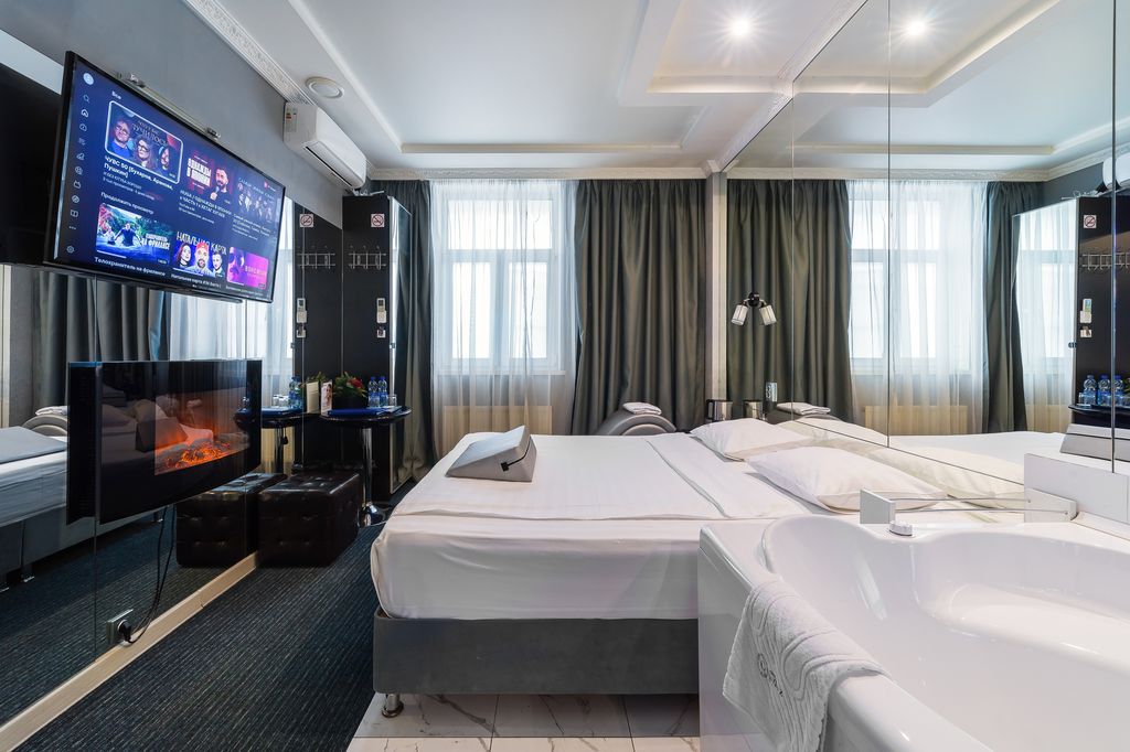 Комфортный для отдыха и проживания номер с душем и креслом-волной "тантра". Романтическую атмосферу создает необычная подсветка, камин и оформление комнаты зеркалами. В номере – есть кондиционер, smart tv, чайник с посудой, мини-бар, вешалка для одежды, столик с удобными креслами, электрический камин, удобная двуспальная кровать. В собственной ванной комнате душ, туалет, набор полотенец, персональные средства гигиены, халаты и тапочки, предусмотренные для каждого гостя.