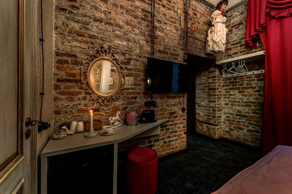 Эксклюзивный мистический отель в Санкт-Петербурге. Mysterio hotel это идеальный выбор для тех, кто ищет не просто отель, но и незабываемые впечатления, сильные эмоции. Визит в Mysterio Hotel это настоящее приключение, которое придаст красок как деловой поездке, так и туристическому визиту. Это прекрасный сюрприз для романтического вечера и необычный подарок для человека, которого сложно удивить. Провести ночь в логове маньяка, в покоях бессмертного графа или с ужасным клоуном? Открыть дверь в астрал, прикоснуться к проклятой кукле? Познакомиться с призраком, живущим в отеле? В Mysterio Hotel нет ничего невозможного. Mysterio Hotel располагается в историческом центре Санкт-Петербурга, на Шпалерной улице. В пешей доступности от отеля находится станция метро Чернышевская. Таврический сад, Летний сад, Михайловский замок, Русский музей и многие другие достопримечательности города. Многочисленные рестораны, бары, магазины и бутики. В баре, расположенном на территории отеля, Вас ждет приятная