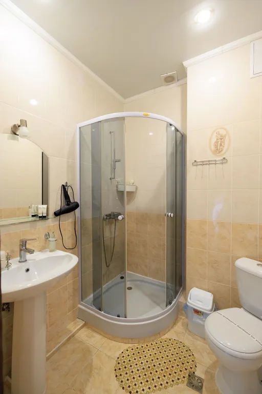 Комфортный номер площадью 16 кв.м. В вашем распоряжении: Санузел: Совмещенный санузел с современной душевой кабиной, фен, мягкие тапочки, полный набор туалетных принадлежностей и два уютных халата. Мебель и техника: Удобная двуспальная кровать (160х200 см), просторный шкаф для одежды, прикроватные тумбы, рабочий стол со стулом. Для вашего комфорта предусмотрены: набор посуды, электрочайник, холодильник, телефон, современный LCD телевизор и кондиционер. Балкон: Просторный балкон, оборудованный мебелью для отдыха. Дополнительное размещение: Возможно предоставление еврораскладушки. Из окна открывается великолепный вид на живописный парк, бескрайнее море и величественные горы.