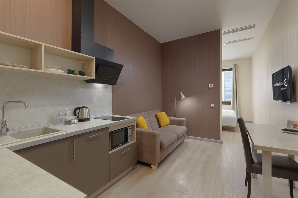 Апартаменты Golden Tulip Krasnodar 4* – яркий отель международной сети в самом сердце города, открывающий новый взгляд на жизнь, бизнес и путешествия, авторскую кухню нашего ресторана, которым хочется делиться с самыми близкими! Golden Tulip Krasnodar расположился в самом центре города, в 7 минутах ходьбы от основных исторических достопримечательностей. Отель находится в непосредственной близости от основной транспортной инфраструктуры города: расстояние от Железнодорожного вокзала «Краснодар-1» – 700 метров, от Международного аэропорта Краснодар «им. Екатерины II» - 15 км. Все номера оснащены кухней с варочной панелью, СВЧ печью, холодильником и набором посуды, высокоскоростным интернетом, ЖК-телевизором с плоским экраном, стиральной машиной и кондиционером. Удобное размещение, высокий уровень сервиса и живописные окрестности делают Отель Golden Tulip Krasnodar идеальным местом для современного ритма жизни, сочетая все необходимое в одном месте. Инфраструктура Отеля включает: 4 конфе