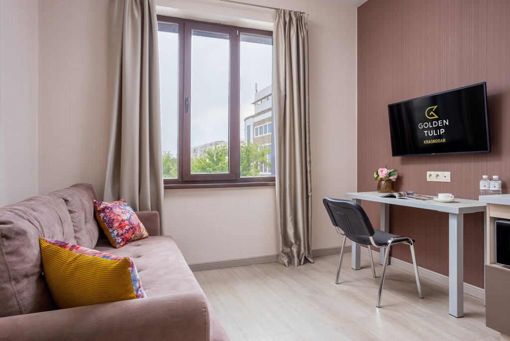Апартаменты Golden Tulip Krasnodar 4* – яркий отель международной сети в самом сердце города, открывающий новый взгляд на жизнь, бизнес и путешествия, авторскую кухню нашего ресторана, которым хочется делиться с самыми близкими! Golden Tulip Krasnodar расположился в самом центре города, в 7 минутах ходьбы от основных исторических достопримечательностей. Отель находится в непосредственной близости от основной транспортной инфраструктуры города: расстояние от Железнодорожного вокзала «Краснодар-1» – 700 метров, от Международного аэропорта Краснодар «им. Екатерины II» - 15 км. Все номера оснащены кухней с варочной панелью, СВЧ печью, холодильником и набором посуды, высокоскоростным интернетом, ЖК-телевизором с плоским экраном, стиральной машиной и кондиционером. Удобное размещение, высокий уровень сервиса и живописные окрестности делают Отель Golden Tulip Krasnodar идеальным местом для современного ритма жизни, сочетая все необходимое в одном месте. Инфраструктура Отеля включает: 4 конфе