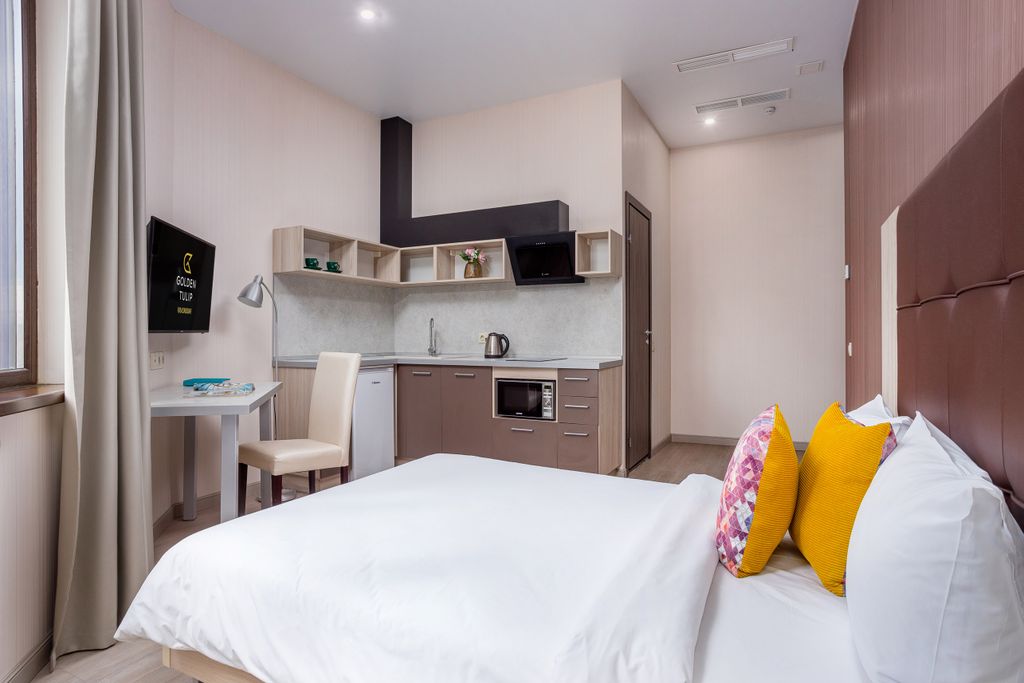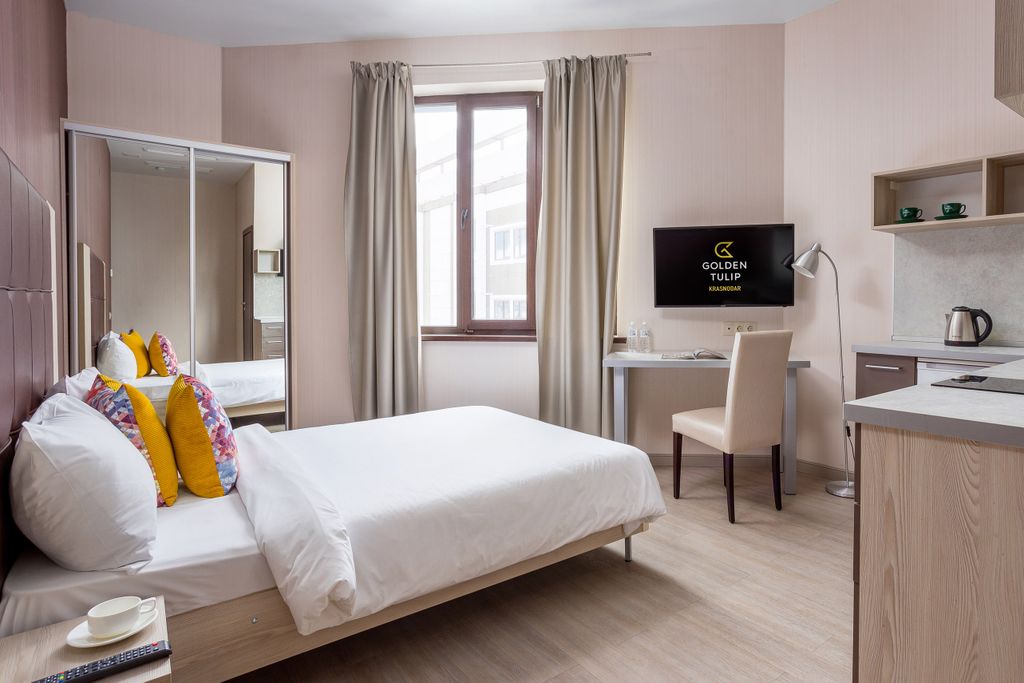Апартаменты Golden Tulip Krasnodar 4* – яркий отель международной сети в самом сердце города, открывающий новый взгляд на жизнь, бизнес и путешествия, авторскую кухню нашего ресторана, которым хочется делиться с самыми близкими! Golden Tulip Krasnodar расположился в самом центре города, в 7 минутах ходьбы от основных исторических достопримечательностей. Отель находится в непосредственной близости от основной транспортной инфраструктуры города: расстояние от Железнодорожного вокзала «Краснодар-1» – 700 метров, от Международного аэропорта Краснодар «им. Екатерины II» - 15 км. Все номера оснащены кухней с варочной панелью, СВЧ печью, холодильником и набором посуды, высокоскоростным интернетом, ЖК-телевизором с плоским экраном, стиральной машиной и кондиционером. Удобное размещение, высокий уровень сервиса и живописные окрестности делают Отель Golden Tulip Krasnodar идеальным местом для современного ритма жизни, сочетая все необходимое в одном месте. Инфраструктура Отеля включает: 4 конфе