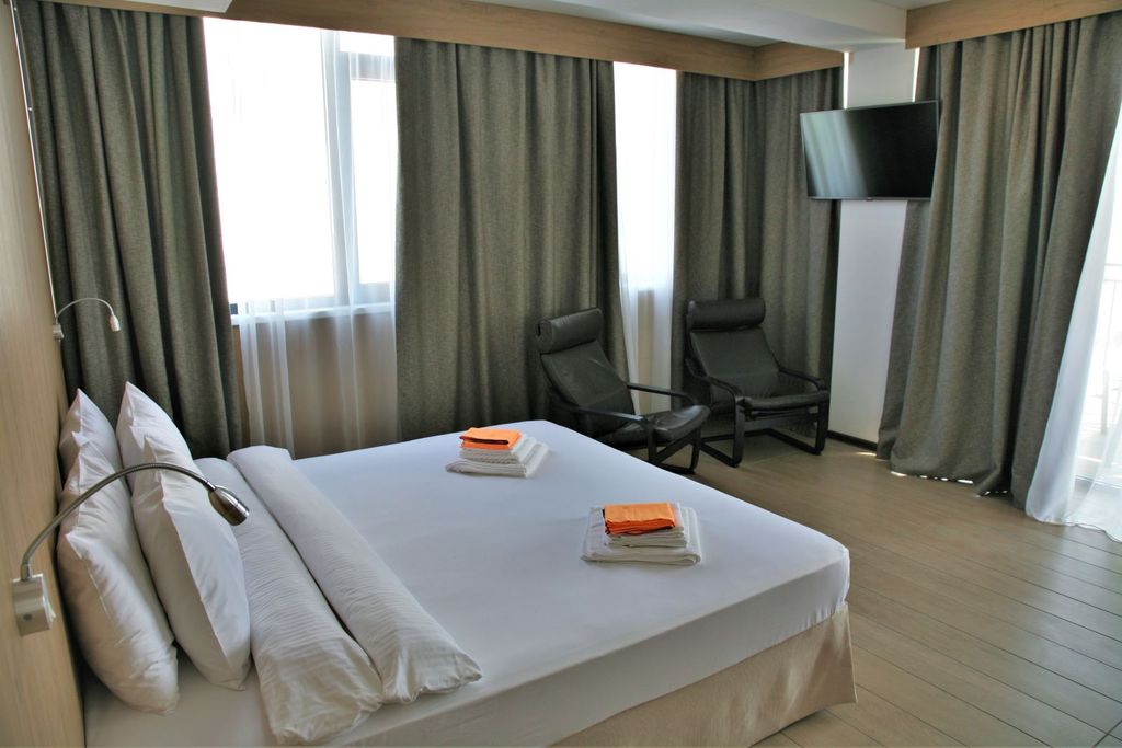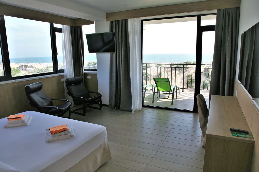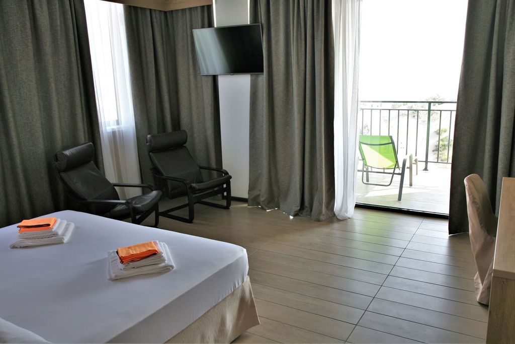 С каждым годом Витязево набирает свои обороты и становится все более известным и популярным местом для отдыха. Совсем недавно Витязево был частью Анапы, поэтому сегодня местные жители воспринимают его как один из районов курорта. Как известно, этот поселок был основан греками, даже не удивляйтесь, когда услышите греческую речь. Греки составляют большую часть населения поселка. «Маленькие Афины» – большинство людей именно так называют поселок Витязево. Здесь можно увидеть набережную Параллию, а на фасадах роскошных домов можно запросто разглядеть классические греческие скульптуры. Большинство домов построены в греческом стиле. Название «Витязево» поселок получил со времен русско-турецкой войны в честь майора Витязя. С одной стороны отель расположен в тихом уютном районе п. Витязево, с другой стороны в 5-ти минутах ходьбы от центра развлечений – Паралии. Здание отеля состоит из 6-ти этажей. Из номеров открывается панорамный вид на море. Для проживания имеются комфортабельные 2-х, 3-х и 4