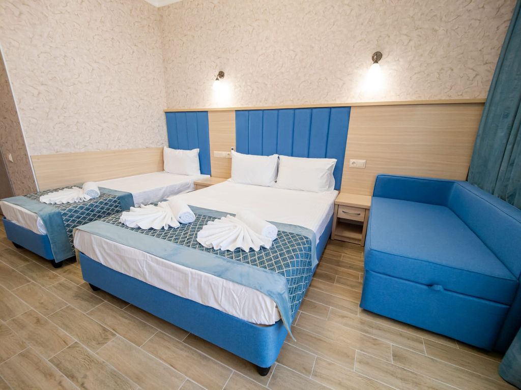 Отель 2022 года постройки, работает первый сезон. Размещает гостей в 2-х, 3-х и 4-х местных номерах площадью 25 и 35 кв. м. Номера на первом этаже имеют террасу с мебелью, на 2-м этаже-балкон с мебелью. В каждом номере-тв (20 каналов) wi-fi, холодильник, кондиционер. На территории удобные места для отдыха-качели (мягкие) шезлонги, столики с зонтами, бассейн. Дорога до моря занимает 5-7 мин пешком (200 метров) по тенистой улице.