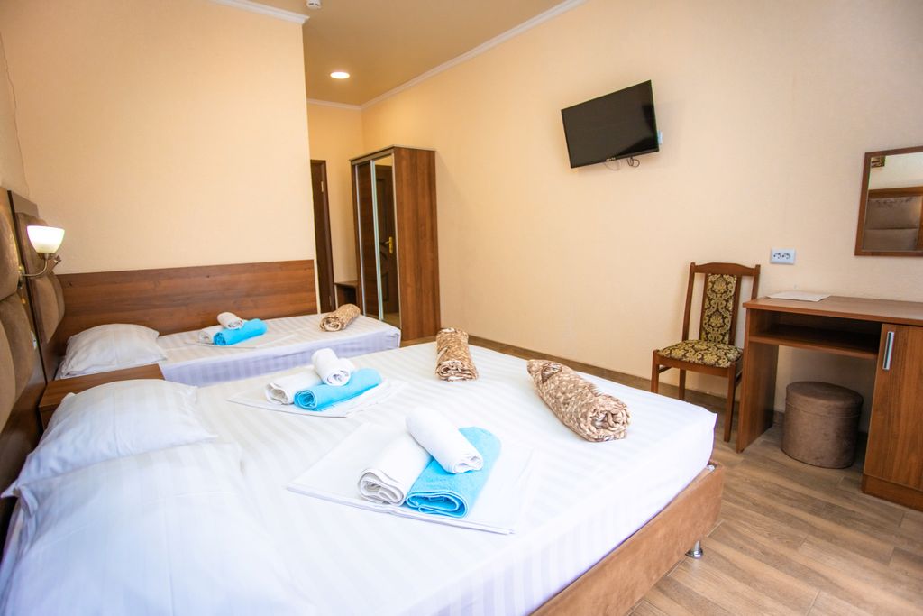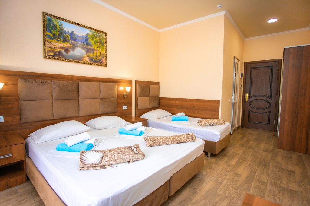 Мы рады предложить Вам отель «Гранд Агатия» и будем счастливы видеть Вас в качестве нашего гостя и предлагаем Вам ощутить гостеприимство в его лучшем проявлении. «Grand Аgatia» - это современная отель, построенный специально для комфортного отдыха на Пионерском проспекте среди Черноморских здравниц и детских лагерей, который славится чистотой, тишиной и близостью к морю. Сам отель построен 2018 году и представляет собой трехэтажное строение с комфортабельными номерами. Уютные номера оснащены всем необходимым для комфортного пребывания в отеле. Во всех номерах качественная мебель и современная техника и сантехника. Каждый номер имеет балкон, сплит-систему, холодильник, жидкокристаллический телевизор с цифровым ТВ, беспроводной интернет, ванную комнату с феном. Для безопасности наших гостей, территория отеля находится под видеонаблюдением. Для автолюбителей имеется автостоянка, как подземная, так и на территории самого отеля. На жилой ухоженной территории отеля можно искупаться