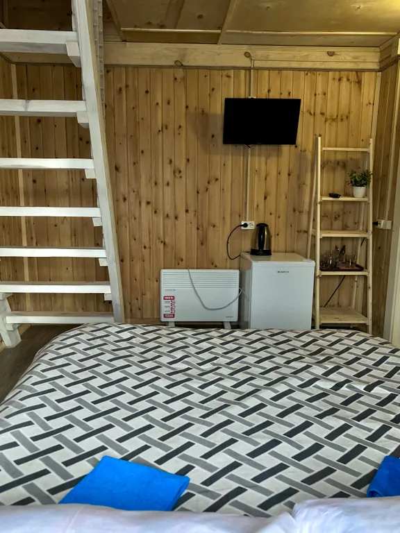 Комфортный домик, состоящий из 1 этажа и антресольного этажа. В доме двуспальная кровать на 1 этаже и бескаркасные кресло-кровати-футоны на антресоли(мансарде), чайник, мини-холодильник, телевизор, отдельный вход, мебель для отдыха на террасе, в ванной комнате душевая кабина, раковина, унитаз, фен. Вид на бассейн, с антресоли на лес. Работает с мая по сентябрь. Гостевой дом работает в формате семейного отдыха. Наши номера и комнаты рассчитаны на семейное комфортное проживание. Мы рады вам и вашим деткам. Вашим небольшим питомцам мы так же рады (нужно согласование, так как практика приёма с питомцами вынудила нас ввести некоторые ограничения). Вам не нужно думать за питание, мы рады вам его организовать. Экскурсии и сплавы также доступны к заказу. Мы всё организуем и договоримся за вас с экскурсоводами. организуем трансфер. При необходимости дадим рекомендации по достопримечательностям. Включено в стоимость -беседки с мангалами -парковка на территории -детская площадка с бату