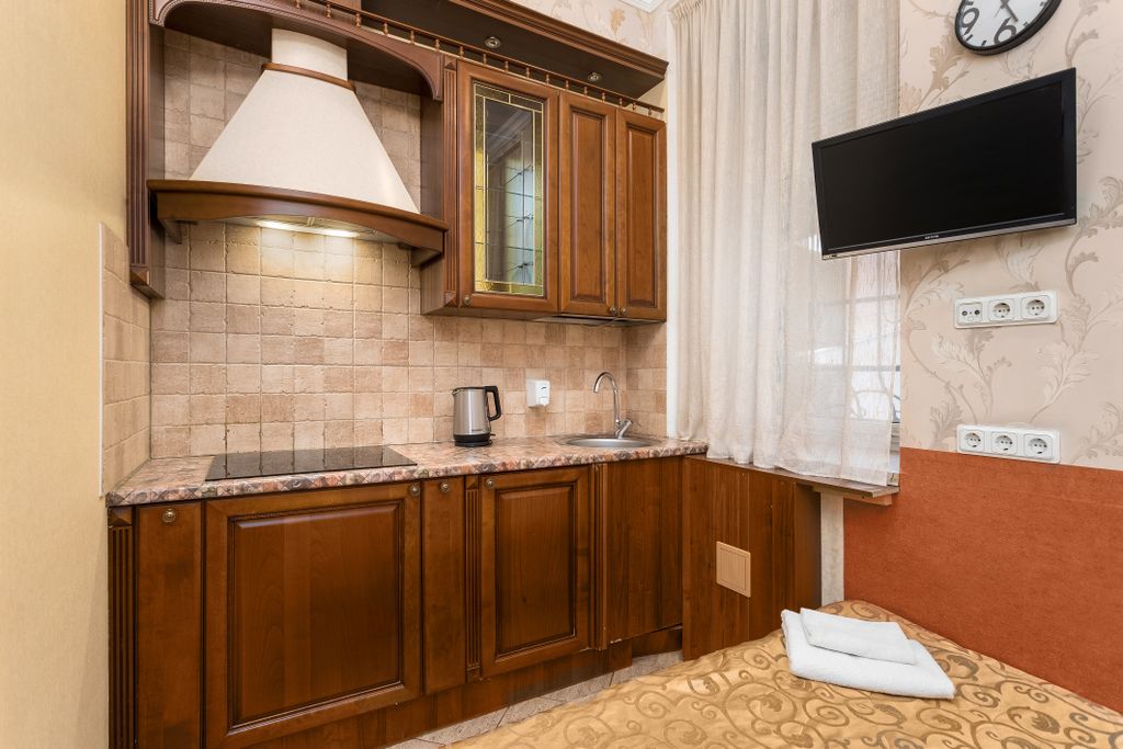 Уютная студия домашнего типа .со своей кухонной зоной, холодильником, ТВ, вай фай. душ и туалет, полотенца. Шкаф с зеркалом в пол. Завтрак можно заказать на месте дополнительно при желании