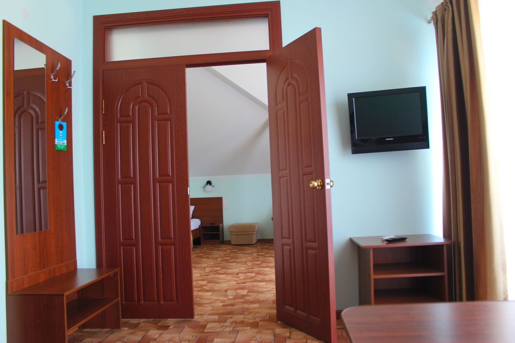 Мы предлагаем вам номера следующих видов: Для 2-4 человек – 2-комнатный или его улучшенный вариант. Для больших семей – 3-комнатный семейный с двумя спальнями и гостиной.Каждый номер в нашем отеле в Анапе соответствует всем нормативам и требованиям. Один ребенок в возрасте до 3 лет (включительно) может проживать бесплатно на дополнительном месте. Вы можете воспользоваться следующими услугами без дополнительной платы: Лежаки и бассейн; Настольный теннис. Детская кроватка для детей до 3-х лет; Анимация для детей; Утюг и гладильная доска; Детская площадка и мангальная зона; Парковка (количество мест ограничено); Wi-Fi в общественных зонах. Дополнительные места Трансфер с аэропортов или жд вокзалов В номерах для отдыха в Анапе есть: Набор посуды; Фен; Чайник; Телевизор; сейф; Фен; Постельное белье; Кондиционер; Полотенца; Телевизор; Холодильник Санузел в каждом номере оборудован душевой кабиной или ванной. Меблированная веранда идеально подходит для вечернего отдыха. Благодаря шумоизоляцио