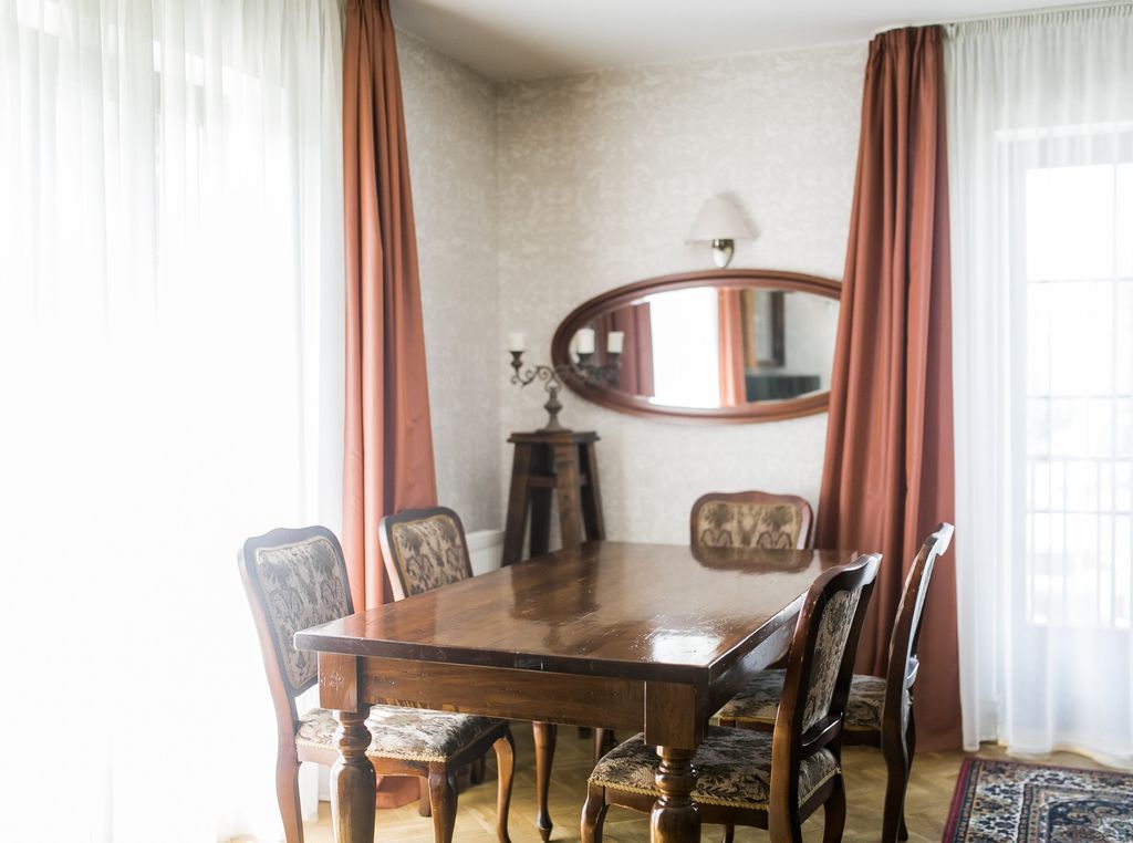 Четырехзвездочный загородный отель «Усадьба» с историей находится в живописном месте недалеко от Калининграда. Это уникальный отель, с рестораном домашней русской кухни и большой территорией для прогулок. В отеле 66 номеров, оформленных в тематическом стиле усадьбы и расположенных в трех зданиях, с видами на сад, бассейн и парковые зоны. Интерьер сочетает в себе атмосферу загородного дома с дизайнерскими авторскими элементами и отреставрированной старинной мебелью. Здесь в каждом номере есть уникальные элементы: старинный камин, антикварные люстры, шкафы и мебель. В отеле есть как классические номера, так и просторные двухкомнатные люксы, а также апартаменты. Гости отеля могут посетить открытый бассейн в летный сезон. Отель расположен в 15 минутах от центра Калининграда, в 17 минутам от аэропорта Храброво и в 20 минутах от ближайшего курортного города на побережье Балтийского моря Зеленоградска.