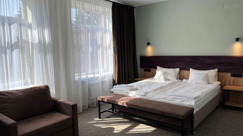 Парк-отель "Нальчик"- расположен в парковой зоне, рядом с источником минеральных целебных вод, Курортным озером (имеется пляж для купания) и Парком аттракционов. На территории отеля собственные зоны отдыха с фонтанами, детская площадка и workout площадка. На 1 этаже здания отеля расположены кофейня, массажный кабинет, сувенирный магазин, косметологический кабинет, ресторан японской кухни, ресторан быстрого питания. Отель подходит как для бизнес-поездок, так и для семейного отдыха с детьми. В отеле сделан новый дизайнерский ремонт в 2022г. Стойка регистрации работает 24 часа в сутки. Номерной фонд отеля состоит из номеров разных категорий. Имеются двухместные номера категории "Стандарт" для недорогого и комфортного проживания. Для больших компаний и семей с детьми предлагаются номера категории "Комфорт двухкомнатный с 2 спальнями", "Полулюкс", "Люкс двухкомнатный". Номера оснащены удобной мебелью в стиле "Лофт" и современной бы