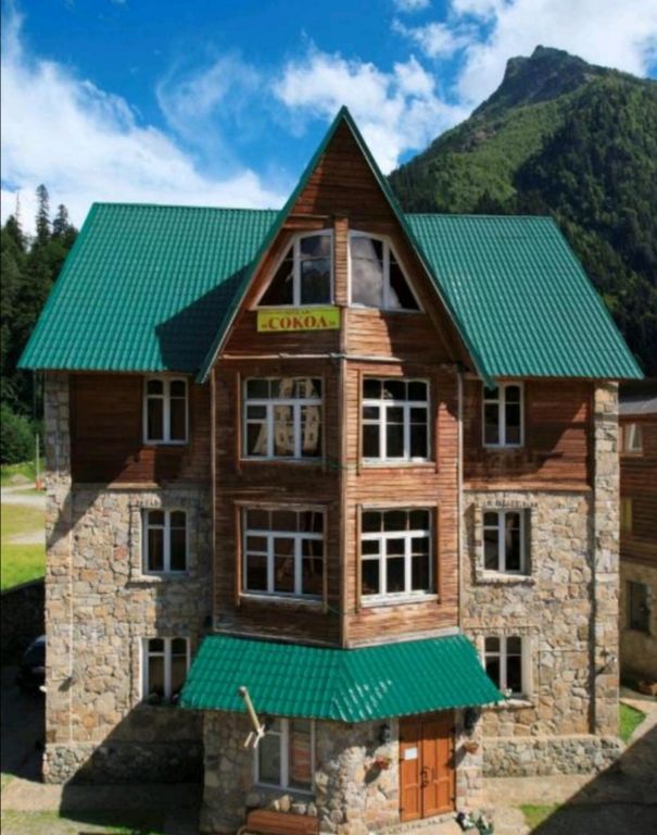 Отель сокол находиться с самом центре курортного поселка домбай. Но в отдалении от главной дороги, гарантируя тишину и спокойствие. На территории отеля есть маленькая уютная русская баня на дровах, мангальная зона со всем необходимым для вашего отдыха с семьей и друзьями. В номерах отделанных натуральным деревом разных пород тепло и уютно. Номера: стандартные двухместные, трёхместные, люксы и полу люксы. В каждом номере есть, холодильник, телевизор, чайник. Санузлы в каждом номере. Стоимость номеров меняется в зависимости от сезона.