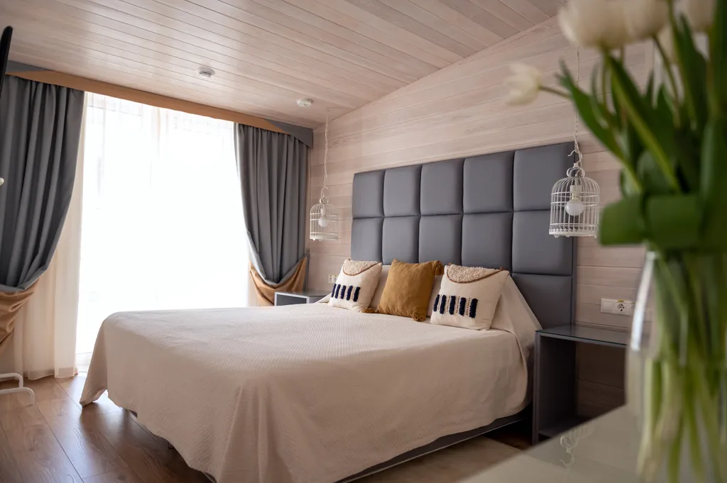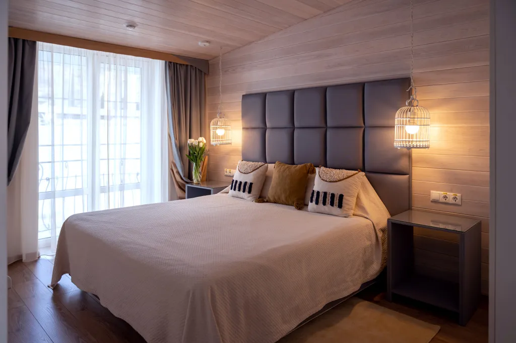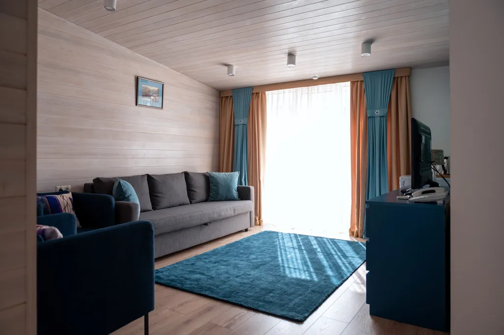 Балкон. Двуспальная кровать (1800х2000) или 2 (900х2000); Доп. место: двуспальный диван; Ортопедический матрац; Гипоаллергенные постельные принадлежности; Телевизор 40” (32”); Холодильник; Местная телефонная связь; Индивидуальный Сейф; Кондиционер; Оборудование для приготовления чая/кофе; Wi-Fi, 160 ТВ каналов в формате HD; Туалетный столик с зеркалом. Возможно размещение одного ребенка до 5 лет включительно бесплатно без предоставления дополнительного спального места(детская кроватка по запросу).