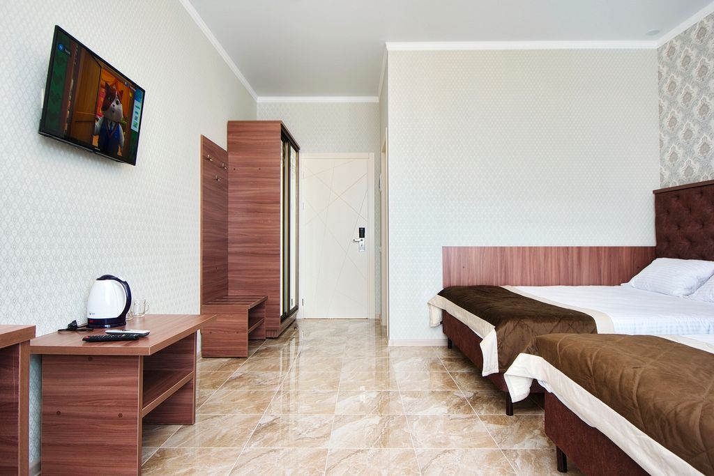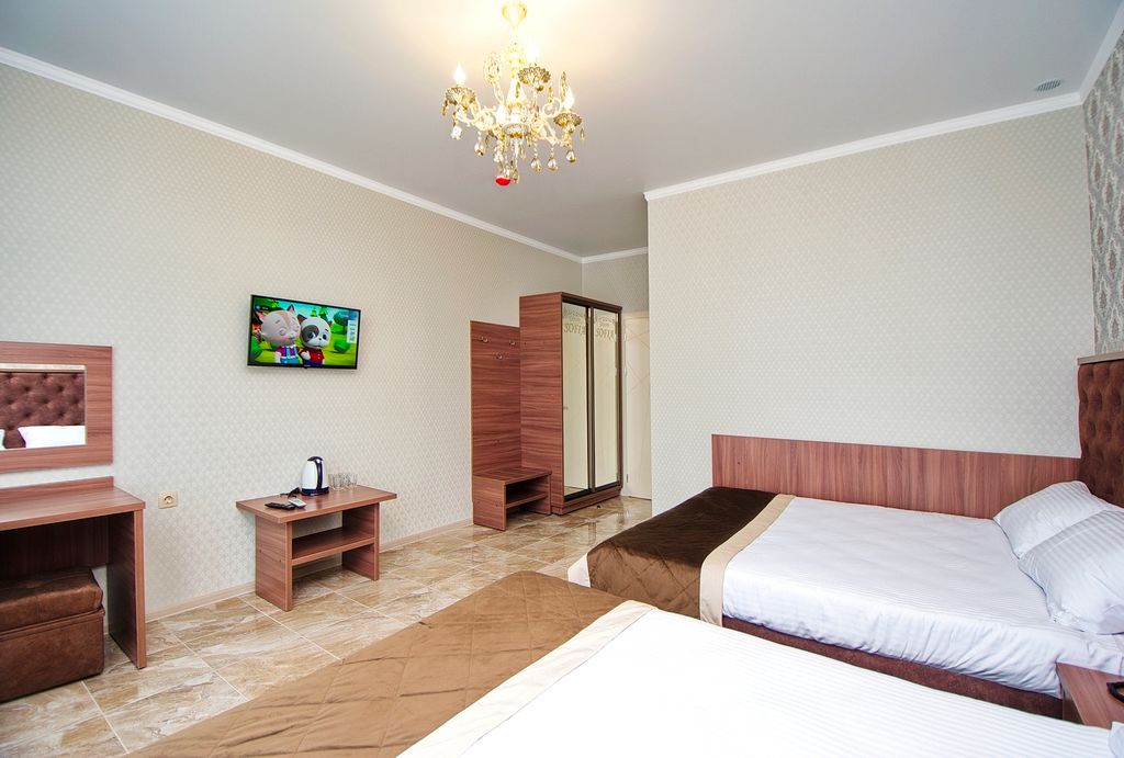 Новый отель Grand Sofia построен в 2022 году. В шаговой доступности рынок, аптеки и магазины! До пешеходной зоны ведущей к морю, парка корницкого, всего 30 метров! А это 3 минуты прогулки! По дороге вы будете очарованы видами гор, привлечены запахами сладостей и играми белок! Grand Sofia — это современный трёхэтажный комплекс, оборудованный лифтом, подземной автопарковкой, большим бассейном с подогревом и детским отделением, расположенный под открытым небом, а так же столовой! Для вашего отдыха представлены благоустроенные однокомнатные и двухкомнатные номера с балконами! Гостиница кабардинки Grand Sofia — это место, где вы найдёте ни с чем несравнимый сервис и незабываемый отдых! Перечень услуг, входящих в стоимость номера: Открытый бассейн с подогревом и детским отделением Парковка Детские анимационные программы Пользование всем оснащением номера, в том числе и кабельным телевидением Ежедневная влажная уборка в номере Замена полотенец и постельного белья Вызов скорой помощи и по