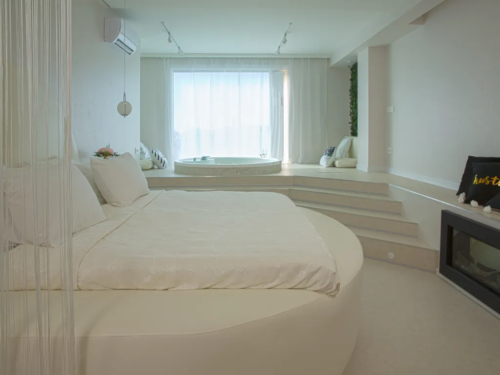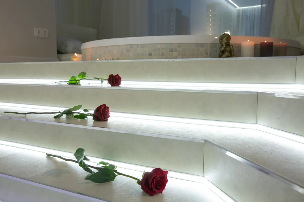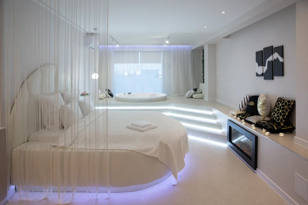 Уникальные апартаменты класса люкс в самом центре города - ЖК «Тринити». Современный минималистичный интерьер с комфортной зоной отдыха, где установлена мягкая кровать King-size, обрамленная легким занавесом - кисеей. На подиуме, к которому ведет лестница, установлено джакузи с гидромассажем и подсветкой, напротив панорамного окна. Интерьерный камин поддержит уютную атмосферу для отдыха, а регулируемая интерьерная подсветка апартаментов позволит с легкостью создать присущее моменту настроение. Имеется кондиционер, обеспечивающий комфортную температуру воздуха в любое время года. ЖК-телевизор со Smart-TV под потолком, работает безлимитный Wi-Fi. Санузел совмещенный, установлен просторный траповый душ, стены и пол которого выложены плиткой. В праздничные дни возможен повышенный залог!