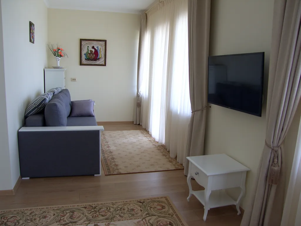 Комфортный номер, с красивой новой мебелью, располагается на 2-м этаже основного здания имеет отдельный вход. В номере 3 душевые кабинки, в каждой комнате (2 спальные комнаты по 20 м2).; Кухня -20 м2, посуда - в достаточном кол-ве. Общий зал (гостиная ) - 45 м2