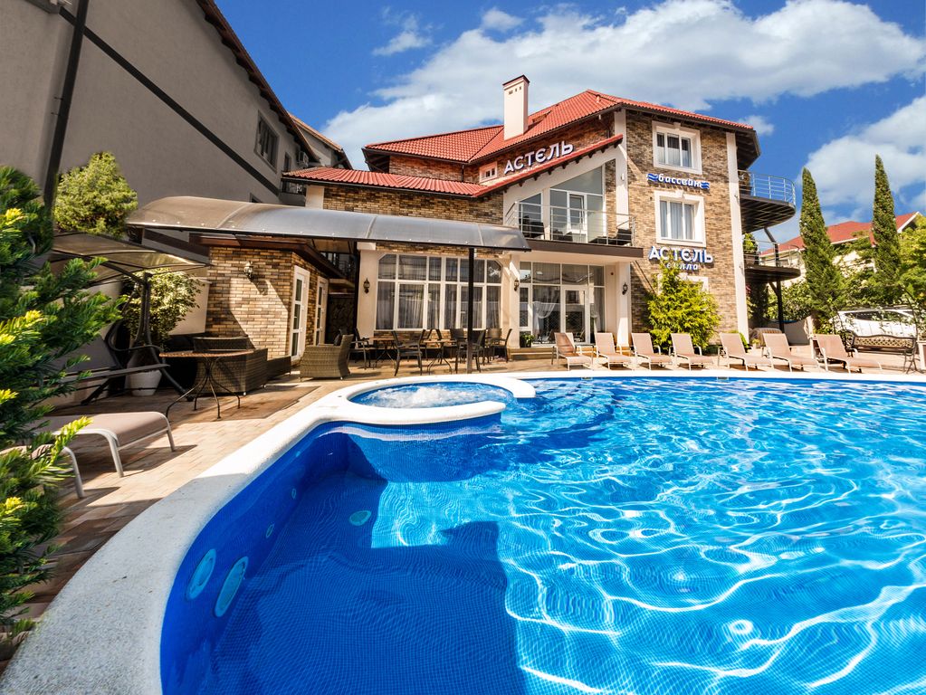 Астель Вилла находится на первой береговой линии, в самом центре города Геленджик. Вилла открылась 18 августа 2018 года. Здание и территория выполнены в европейском стиле. Интерьеры холлов и номеров понравятся самым требовательным гостям. На Вилле установлено современное сантехническое, отопительное и охлаждающее оборудование. Тёплые полы и полотенцесушители имеются в каждой ванной комнате. Хорошая звукоизоляция стен и ковровое покрытие в коридорах, создаёт акустический комфорт. В номерах отеля и зонах общего пользования, а также на всей прилегающей территории имеется высокоскоростной бесшовный Wi-Fi. На территории есть открытый бассейн подогреваемый круглогодично с зоной джакузи и финской сауной с гималайской солью. Вокруг бассейна расположен ряд шезлонгов для любителей солнечных ванн. Беседка с большим столом и мангалом понравится любителям шашлыка. Для самых маленьких есть детская игровая зона. Лаунж-зона для вечернего отдыха. Вся территория радует разнообразием цветов на фоне строг