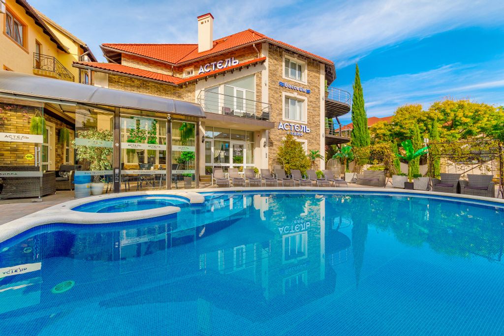 Астель Вилла находится на первой береговой линии, в самом центре города Геленджик. Вилла открылась 18 августа 2018 года. Здание и территория выполнены в европейском стиле. Интерьеры холлов и номеров понравятся самым требовательным гостям. На Вилле установлено современное сантехническое, отопительное и охлаждающее оборудование. Тёплые полы и полотенцесушители имеются в каждой ванной комнате. Хорошая звукоизоляция стен и ковровое покрытие в коридорах, создаёт акустический комфорт. В номерах отеля и зонах общего пользования, а также на всей прилегающей территории имеется высокоскоростной бесшовный Wi-Fi. На территории есть открытый бассейн подогреваемый круглогодично с зоной джакузи и финской сауной с гималайской солью. Вокруг бассейна расположен ряд шезлонгов для любителей солнечных ванн. Беседка с большим столом и мангалом понравится любителям шашлыка. Для самых маленьких есть детская игровая зона. Лаунж-зона для вечернего отдыха. Вся территория радует разнообразием цветов на фоне строг